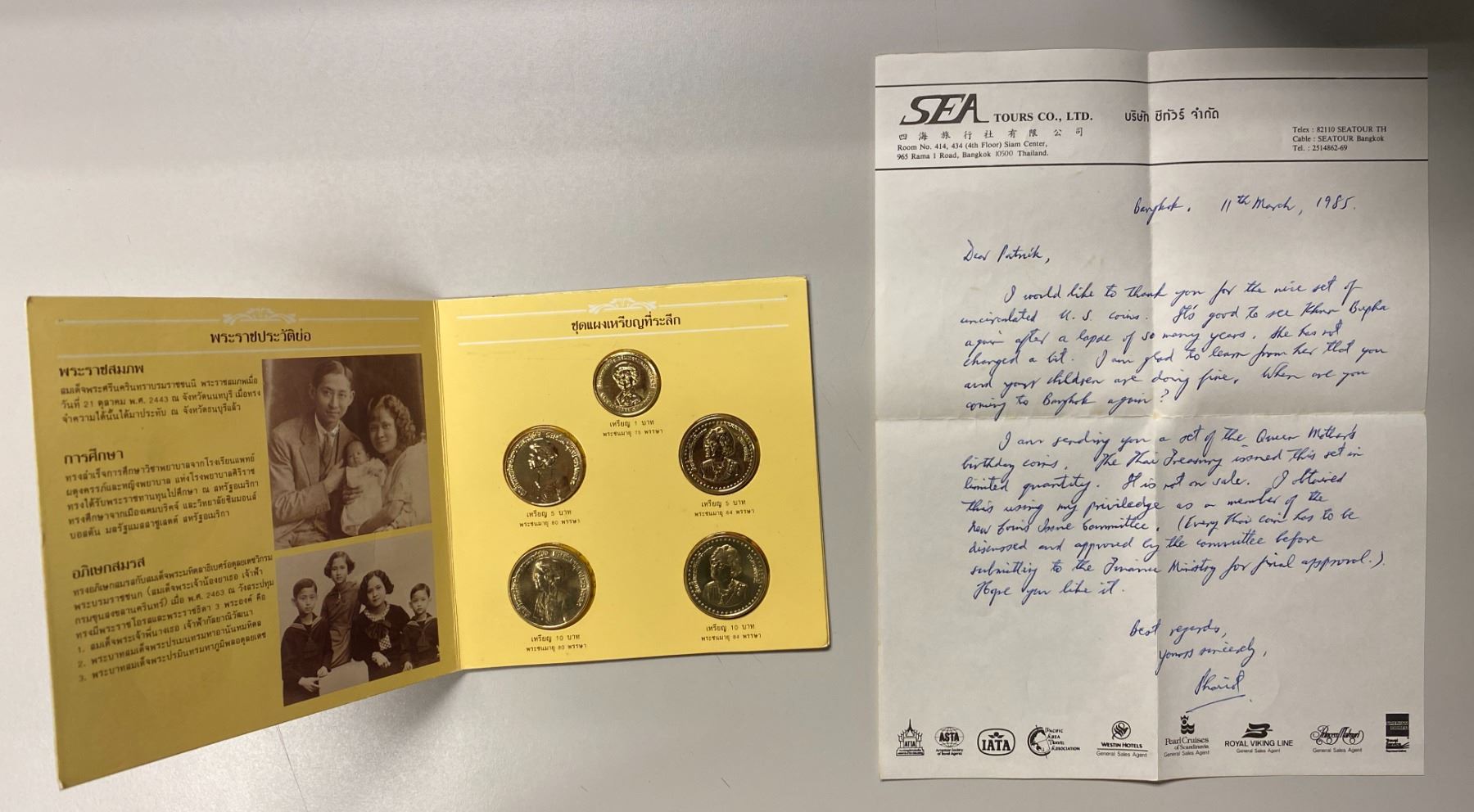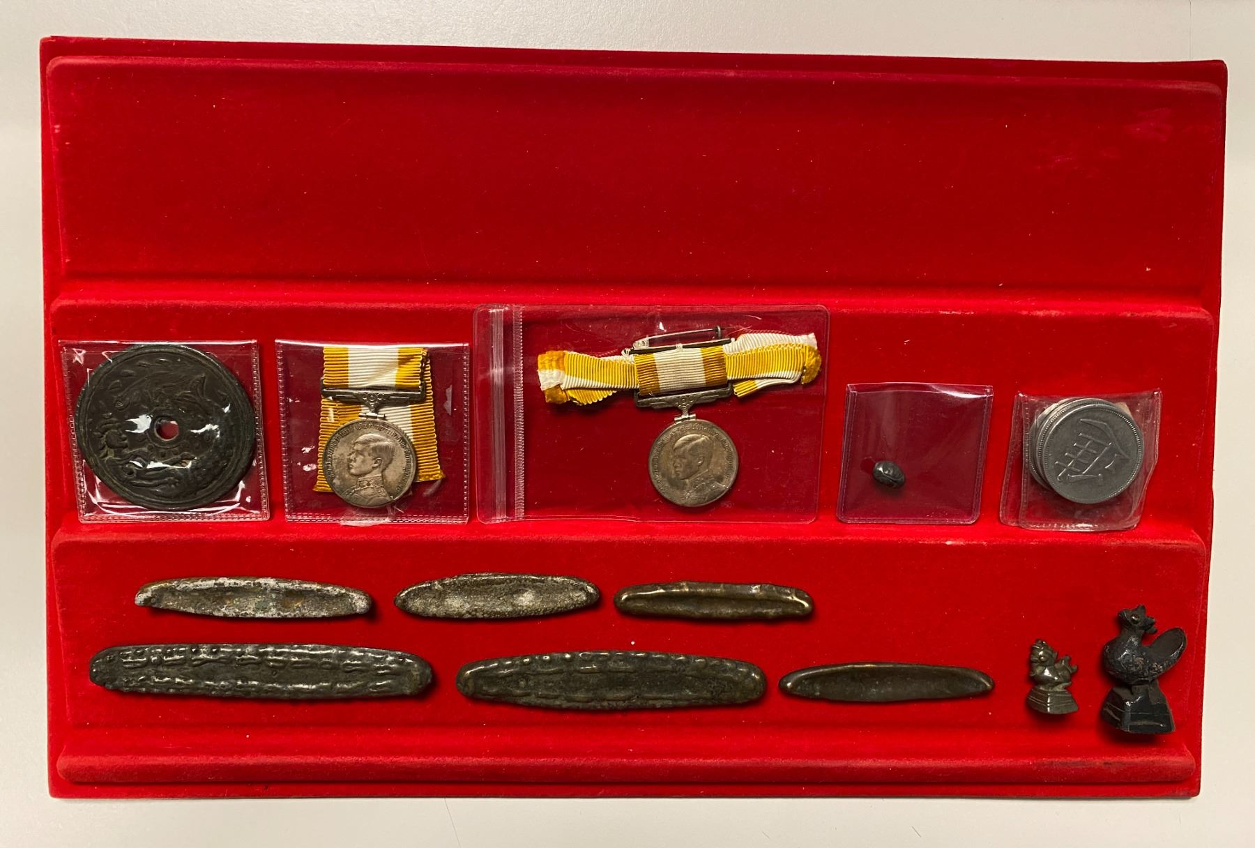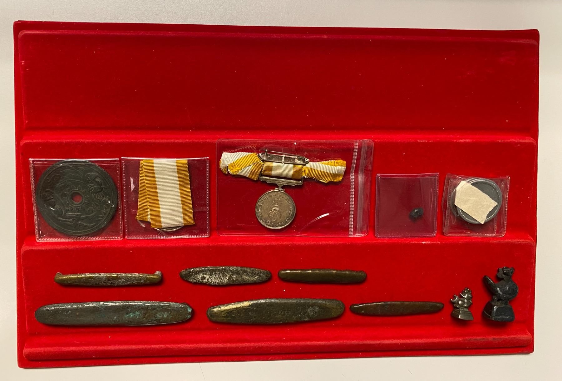 SOUTHEAST ASIA: LOT of 17 items, including 4 items of Thailand (Queen's Mother 1984 5-coin UNC set; 2 Rachada Bhisek 1972 silver medals for the investiture of the crown prince, with ribbon; and a pre-Rattanakosin AR 1/4 baht bullet money, with elephant stamp), 6 lat money of Laos (all nearly all copper, from 24g to 90g, the largest one likely a later imitation), 2 Burmese opium weights (a one kyat bird, plus a modern production), a 59mm Cambodian-style charm (mermaid, likely from 20th century), and 4 aluminum tokens (Chinese character jin // $1.00); retail value $200, lot of 17 items.
