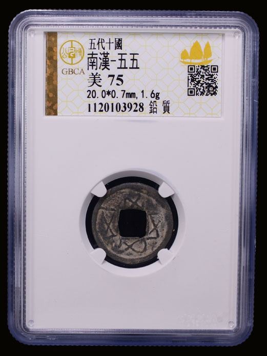 SOUTHERN HAN: Anonymous, 900-971, lead cash (1.6g), H-15.154, wu wu wu wu, graded 75 by GBCA Grading Company, F-VF, ex Dr. Dirk Löer Collection. These were part of a series of crude lead cash coins attributed to the Southern Han / Chu area cast circa 900-971 based on Tang Dynasty inscriptions. There is a very great variety of such coins; some have crescents on the reverse, others a variety of characters. The 'kai' character sometimes looks like the character 'yong.' The characters and legends often are reversed because the incompetent workmen had not mastered the art of engraving in negative to make the molds. Some specimens have meaningless characters.