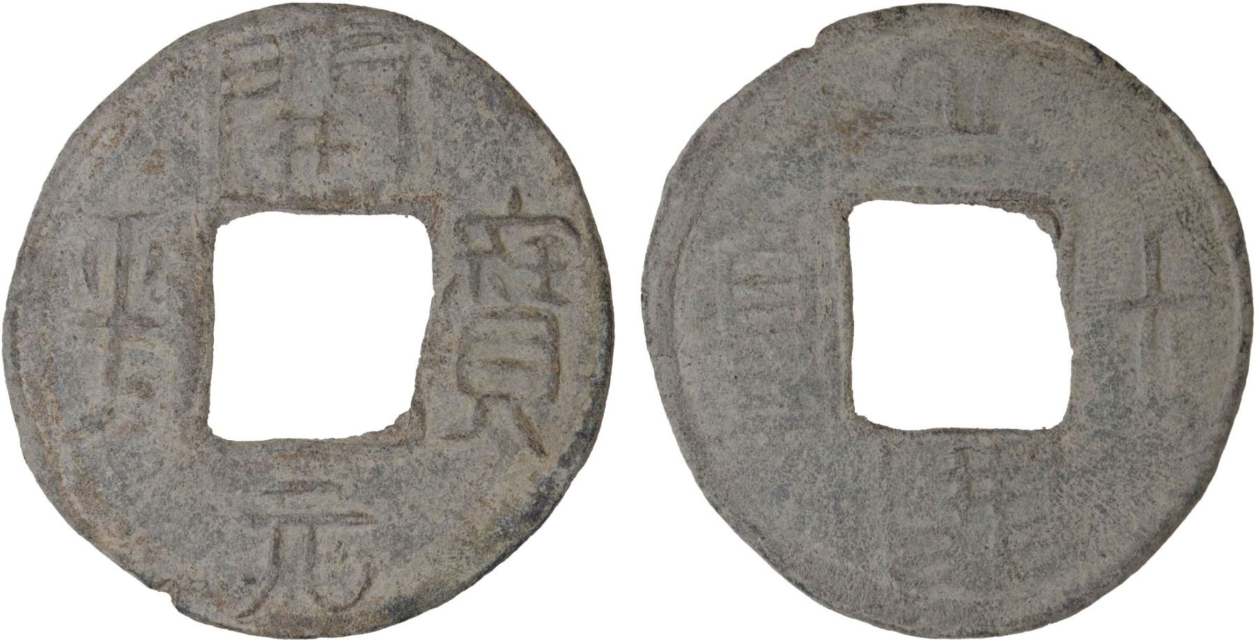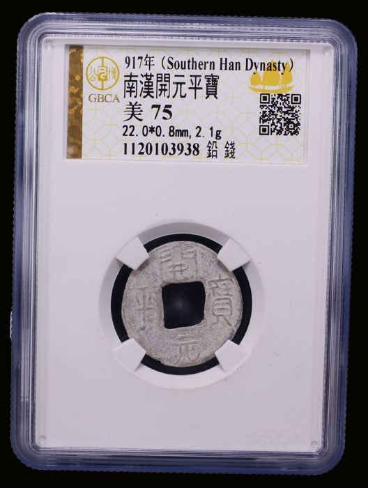 SOUTHERN HAN: Anonymous, 900-971, lead cash (2.1g), kai yuan bao ping, graded 75 by GBCA Grading Company, VF, ex Dr. Dirk Löer Collection. These were part of a series of crude lead cash coins attributed to the Southern Han / Chu area cast circa 900-971 based on Tang Dynasty inscriptions. There is a very great variety of such coins; some have crescents on the reverse, others a variety of characters. The 'kai' character sometimes looks like the character 'yong.' The characters and legends often are reversed because the incompetent workmen had not mastered the art of engraving in negative to make the molds. Some specimens have meaningless characters.