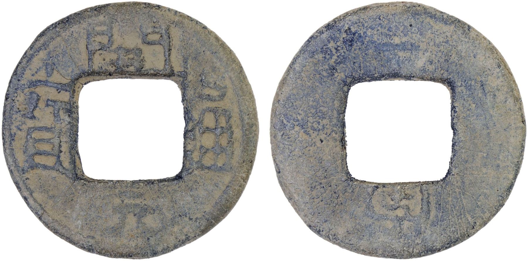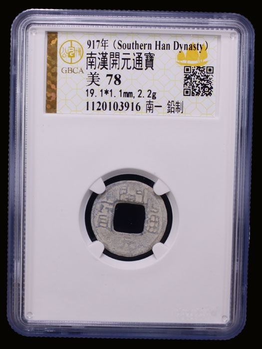 SOUTHERN HAN: Anonymous, 900-971, lead cash (2.2g), H-15.126, kai yuan tong bao // yi liang, graded 78 by GBCA Grading Company, F-VF, ex Dr. Dirk Löer Collection. These were part of a series of crude lead cash coins attributed to the Southern Han / Chu area cast circa 900–971 based on Tang Dynasty inscriptions. There is a very great variety of such coins; some have crescents on the reverse, others a variety of characters. The 'kai' character sometimes looks like the character 'yong.' The characters and legends often are reversed because the incompetent workmen had not mastered the art of engraving in negative to make the molds. Some specimens have meaningless characters.