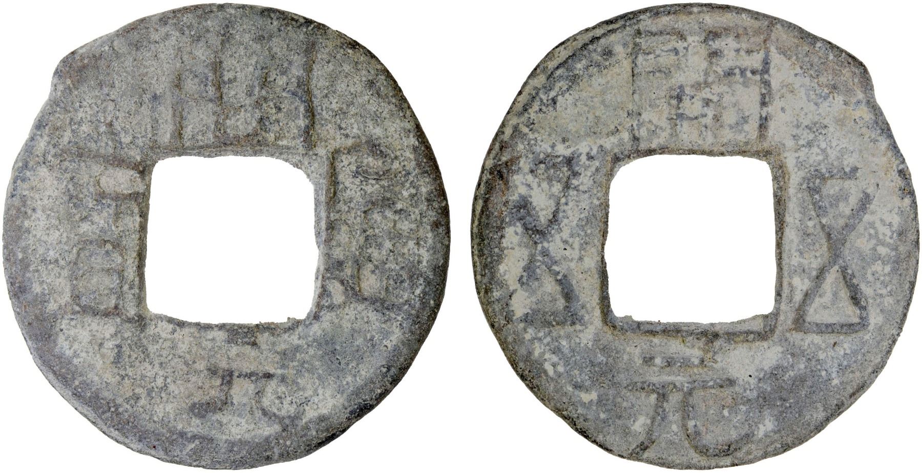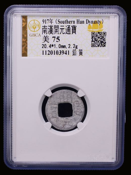 SOUTHERN HAN: Anonymous, 900-971, lead cash (2.2g), kai yuan tong bao // kai yuan wu wu, graded 75 by GBCA Grading Company, VF, ex Dr. Dirk Löer Collection. These were part of a series of crude lead cash coins attributed to the Southern Han / Chu area cast circa 900-971 based on Tang Dynasty inscriptions. There is a very great variety of such coins; some have crescents on the reverse, others a variety of characters. The 'kai' character sometimes looks like the character 'yong.' The characters and legends often are reversed because the incompetent workmen had not mastered the art of engraving in negative to make the molds. Some specimens have meaningless characters.