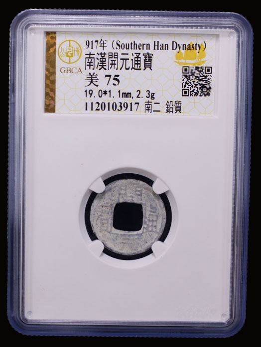 SOUTHERN HAN: Anonymous, 900-971, lead cash (2.3g), H-15.127, kai yuan tong bao // nan er, graded 75 by GBCA Grading Company, F-VF, ex Dr. Dirk Löer Collection. These were part of a series of crude lead cash coins attributed to the Southern Han / Chu area cast circa 900–971 based on Tang Dynasty inscriptions. There is a very great variety of such coins; some have crescents on the reverse, others a variety of characters. The 'kai' character sometimes looks like the character 'yong.' The characters and legends are often reversed because the incompetent workmen had not mastered the art of engraving in negative to make the molds. Some specimens have meaningless characters.