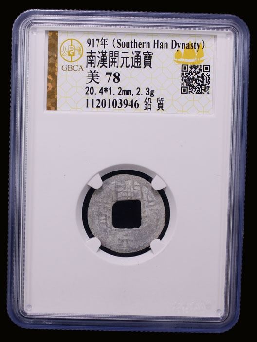 SOUTHERN HAN: Anonymous, 900-971, lead cash (2.3g), kai yuan tong bao // qian heng tong bao, graded 78 by GBCA Grading Company, F-VF, ex Dr. Dirk Löer Collection. These were part of a series of crude lead cash coins attributed to the Southern Han / Chu area cast circa 900-971 based on Tang Dynasty inscriptions. There is a very great variety of such coins; some have crescents on the reverse, others a variety of characters. The 'kai' character sometimes looks like the character 'yong.' The characters and legends often are reversed because the incompetent workmen had not mastered the art of engraving in negative to make the molds. Some specimens have meaningless characters.