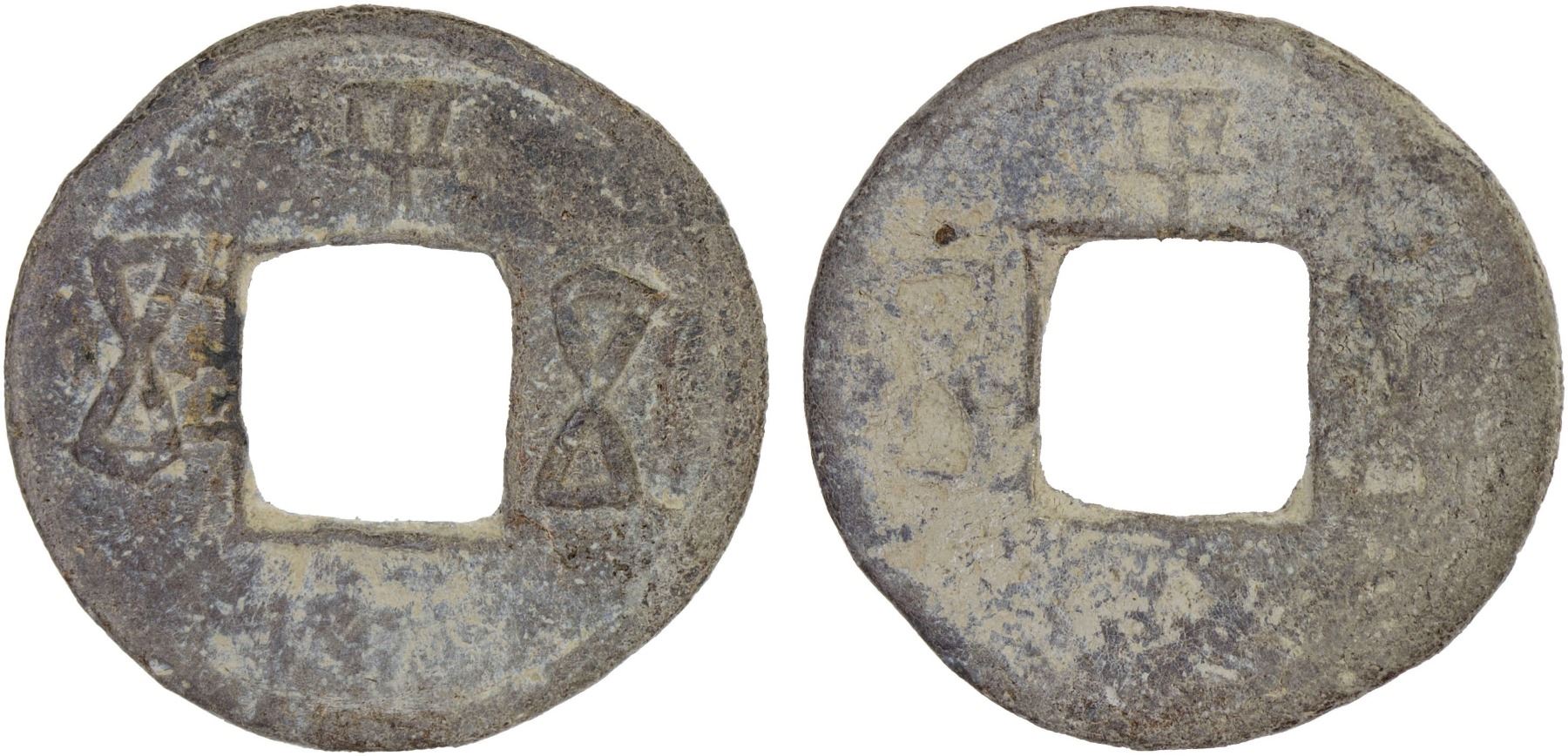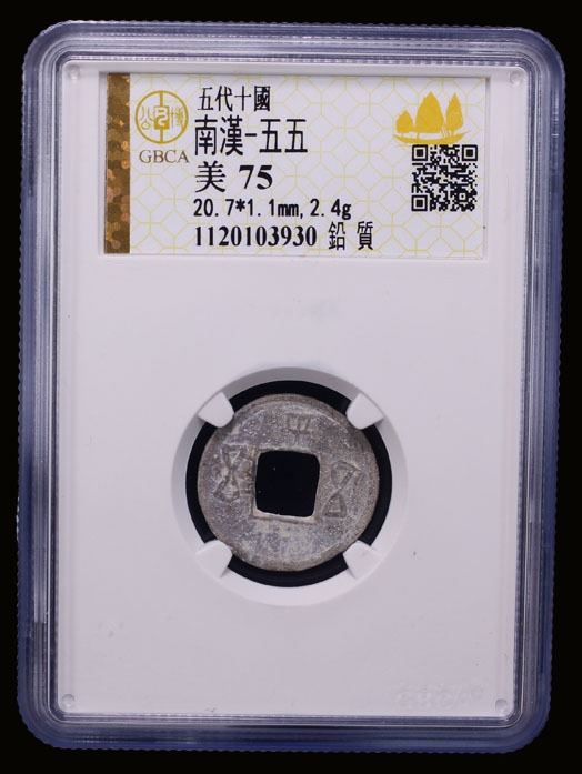 SOUTHERN HAN: Anonymous, 900-971, lead cash (2.4g), H-15.145var, wu wu, with possibly ping above, same inscription on either side, graded 75 by GBCA Grading Company, F-VF, ex Dr. Dirk Löer Collection. These were part of a series of crude lead cash coins attributed to the Southern Han / Chu area cast circa 900-971 based on Tang Dynasty inscriptions. There is a very great variety of such coins; some have crescents on the reverse, others a variety of characters. The 'kai' character sometimes looks like the character 'yong.' The characters and legends often are reversed because the incompetent workmen had not mastered the art of engraving in negative to make the molds. Some specimens have meaningless characters.