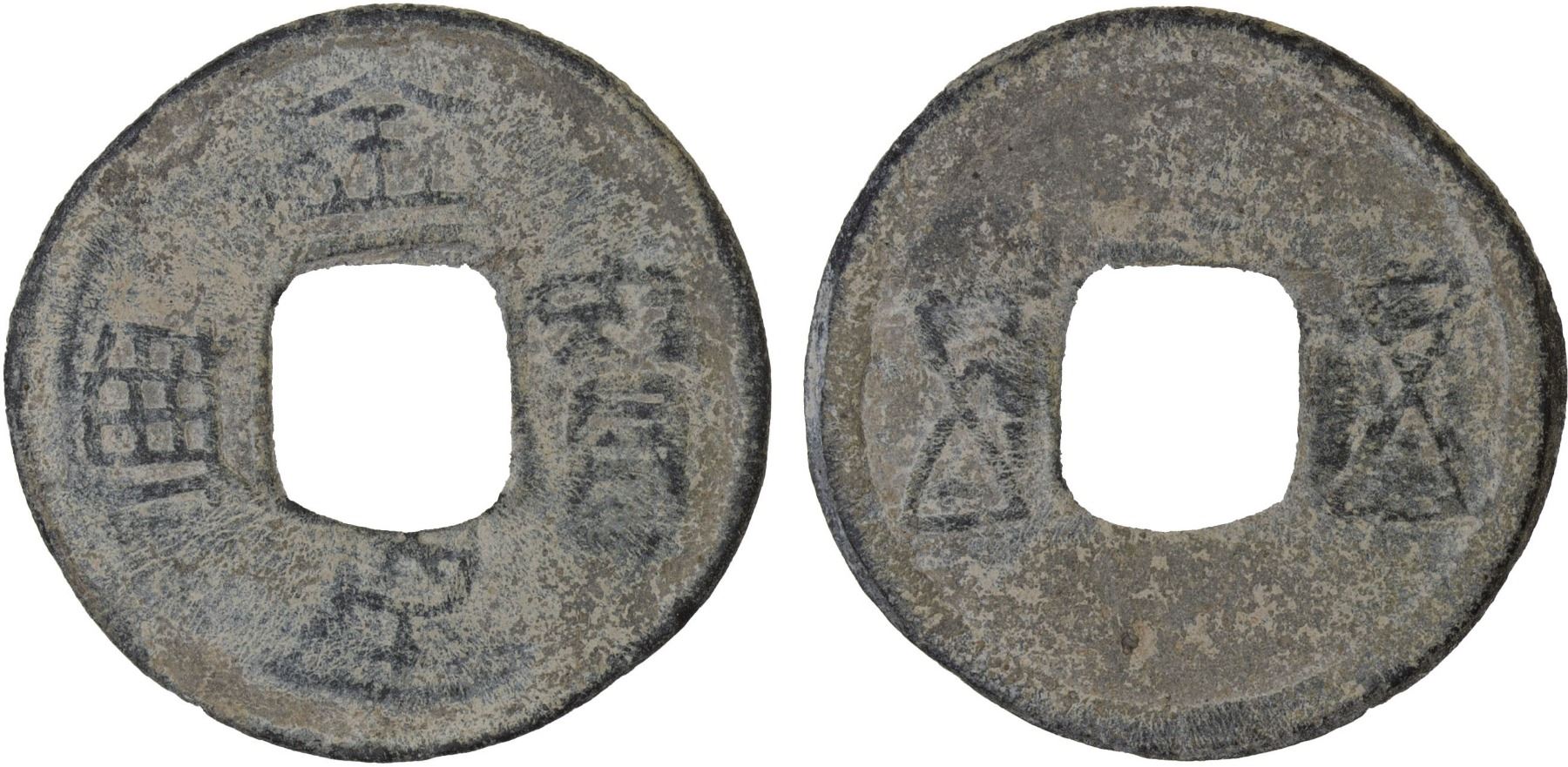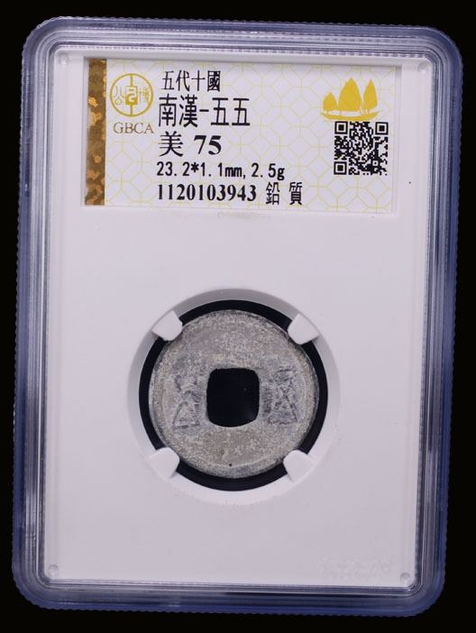 SOUTHERN HAN: Anonymous, 900-971, lead cash (2.5g), wu wu, with uncertain inscription on reverse, graded 75 by GBCA Grading Company, F-VF, ex Dr. Dirk Löer Collection. These were part of a series of crude lead cash coins attributed to the Southern Han / Chu area cast circa 900-971 based on Tang Dynasty inscriptions. There is a very great variety of such coins; some have crescents on the reverse, others a variety of characters. The 'kai' character sometimes looks like the character 'yong.' The characters and legends often are reversed because the incompetent workmen had not mastered the art of engraving in negative to make the molds. Some specimens have meaningless characters.