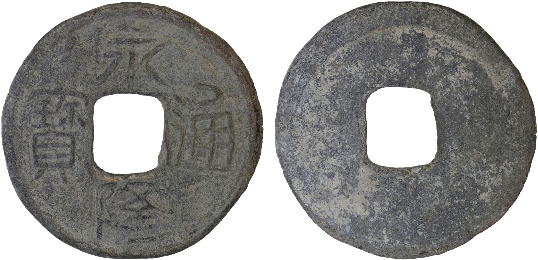 SOUTHERN HAN: Anonymous, 900-971, lead cash (2.5g), yong long tong bao, graded 75 by GBCA Grading Company, F-VF, ex Dr. Dirk Löer Collection. These were part of a series of crude lead cash coins attributed to the Southern Han / Chu area cast circa 900-971 based on Tang Dynasty inscriptions. There is a very great variety of such coins; some have crescents on the reverse, others a variety of characters. The 'kai' character sometimes looks like the character 'yong.' the characters and legends often are reversed because the incompetent workmen had not mastered the art of engraving in negative to make the molds. Some specimens have meaningless characters.