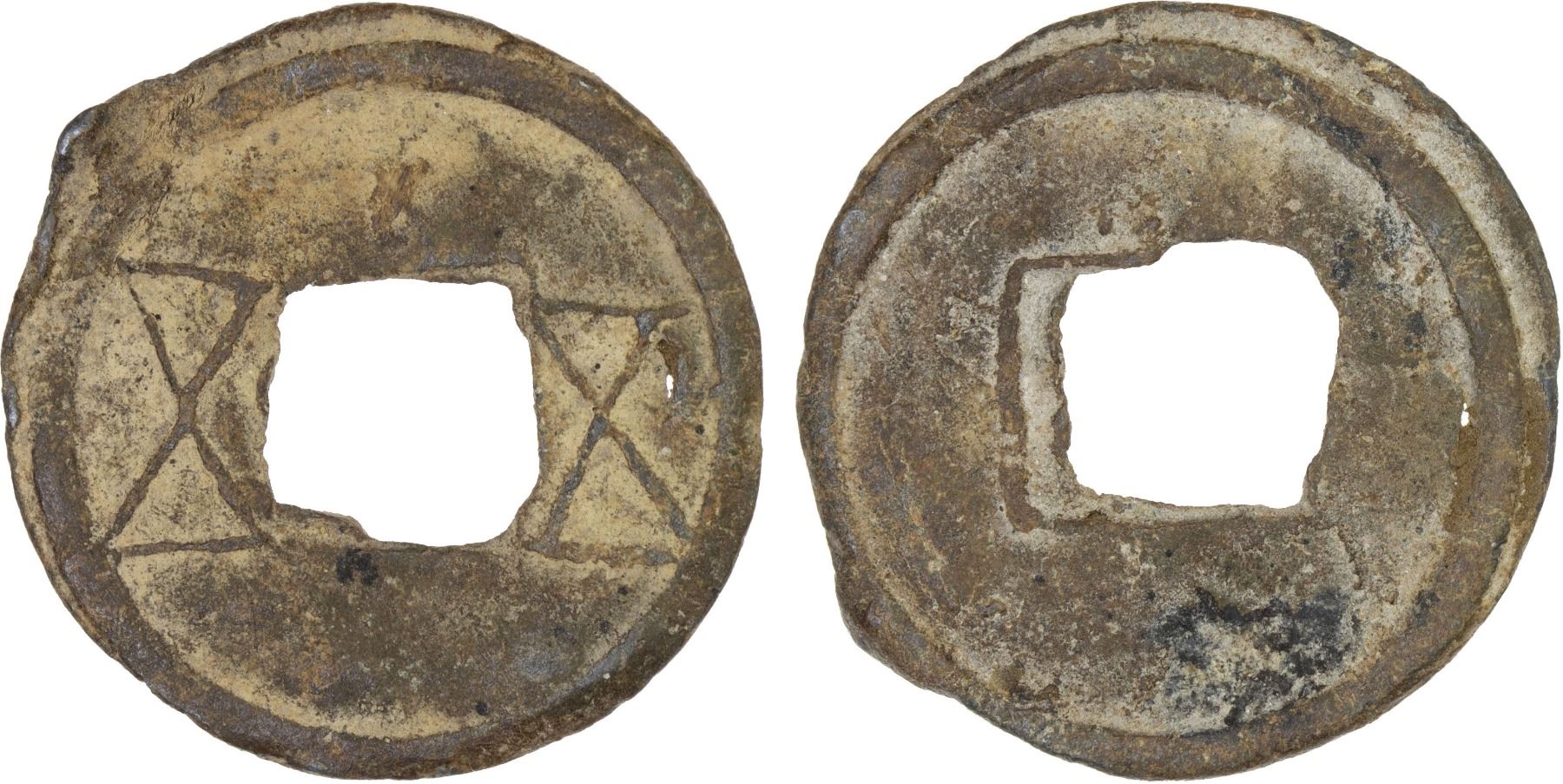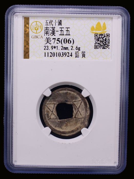 SOUTHERN HAN: Anonymous, 900-971, lead cash (2.6g), H-15.145, wu wu, graded 75(06) by GBCA Grading Company, artificial defect, F-VF, ex Dr. Dirk Löer Collection. These were part of a series of crude lead cash coins attributed to the Southern Han / Chu area cast circa 900-971 based on Tang Dynasty inscriptions. There is a very great variety of such coins; some have crescents on the reverse, others a variety of characters. The 'kai' character sometimes looks like the character 'yong.' The characters and legends often are reversed because the incompetent workmen had not mastered the art of engraving in negative to make the molds. Some specimens have meaningless characters.
