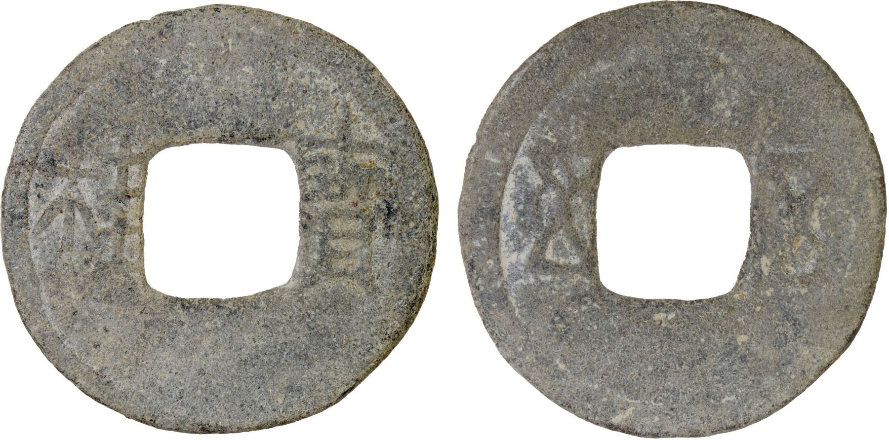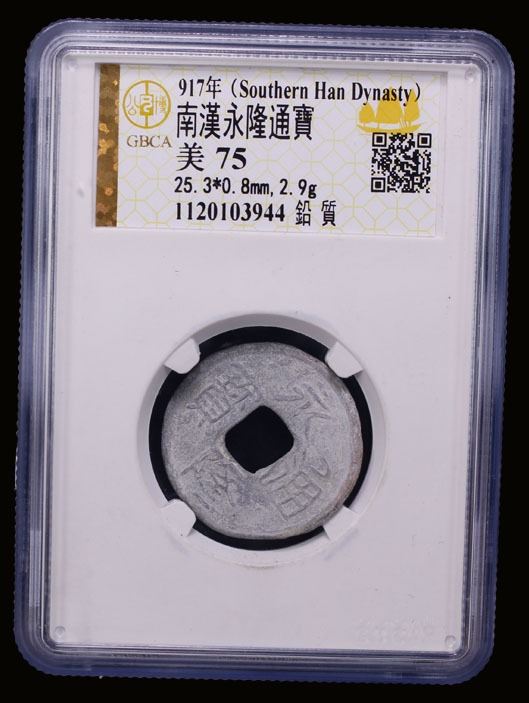 SOUTHERN HAN: Anonymous, 900-971, lead cash (2.7g), wu wu // bao gui, graded 75 by GBCA Grading Company, VF, ex Dr. Dirk Löer Collection. These were part of a series of crude lead cash coins attributed to the Southern Han / Chu area cast circa 900-971 based on Tang Dynasty inscriptions. There is a very great variety of such coins; some have crescents on the reverse, others a variety of characters. The 'kai' character sometimes looks like the character 'yong.' the characters and legends often are reversed because the incompetent workmen had not mastered the art of engraving in negative to make the molds. Some specimens have meaningless characters.