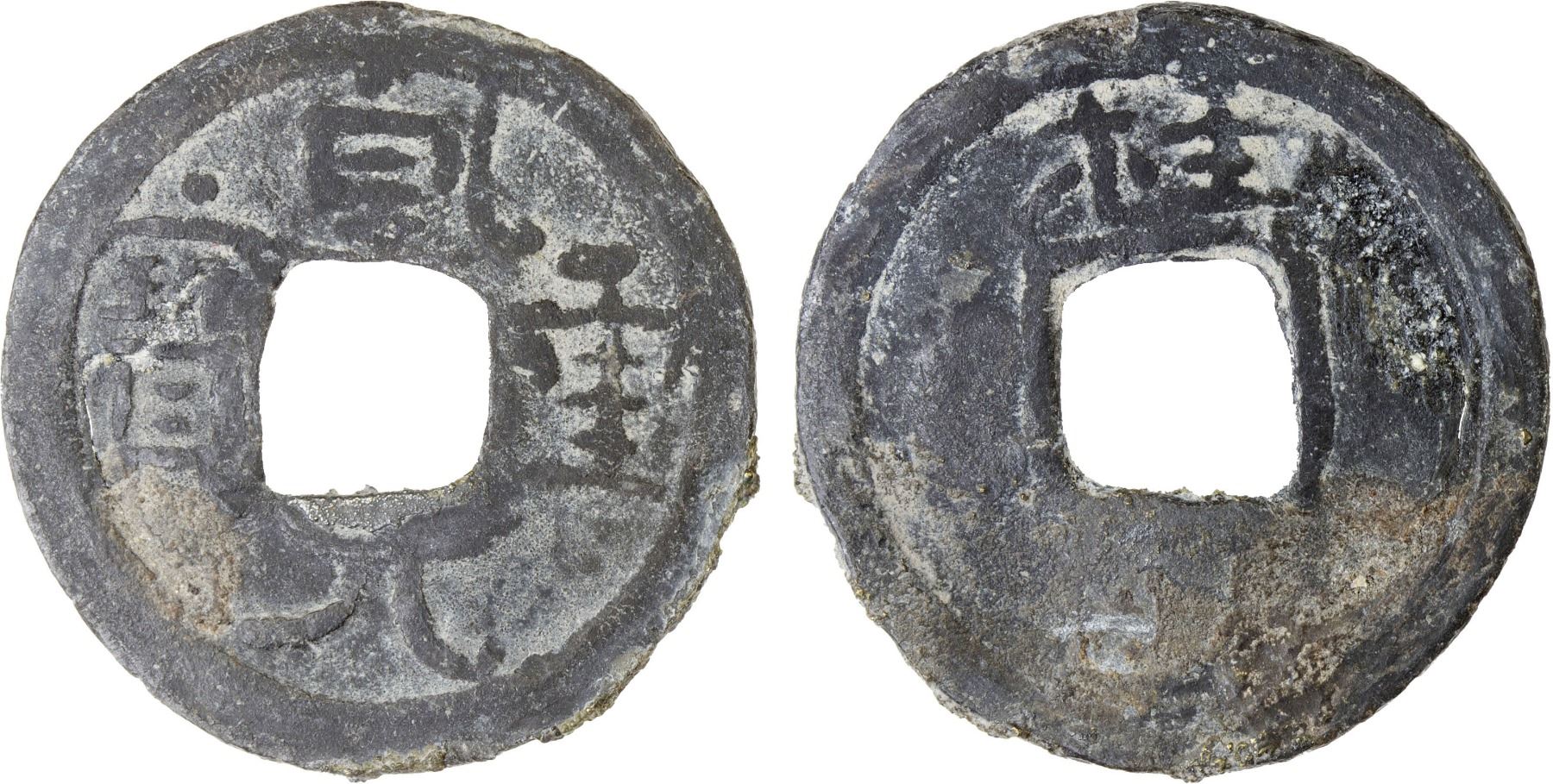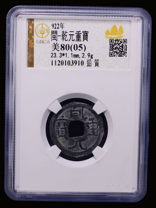 SOUTHERN HAN: Anonymous, 900-971, lead cash (2.9g), H-15.70var, qian yuan zhong bao, possibly zi on reverse, graded 80(05) by GBCA Grading Company, natural flan crack, VF, ex Dr. Dirk Löer Collection. These were part of a series of crude lead cash coins attributed to the Southern Han / Chu area cast circa 900-971 based on Tang Dynasty inscriptions. There is a very great variety of such coins; some have crescents on the reverse, others a variety of characters. The 'kai' character sometimes looks like the character 'yong.' The characters and legends are often reversed because the incompetent workmen had not mastered the art of engraving in negative to make the molds. Some specimens have meaningless characters.