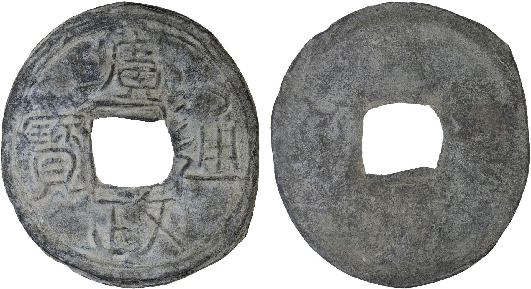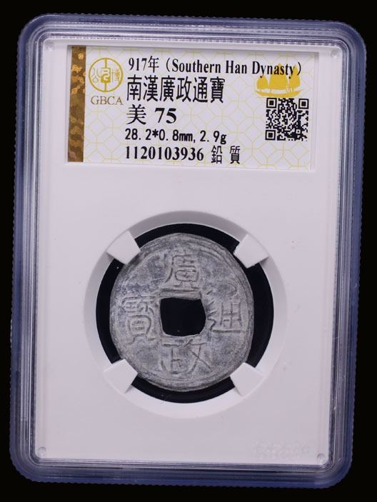SOUTHERN HAN: Anonymous, 900-971, lead cash (2.9g), guang zheng tong bao, graded 75 by GBCA Grading Company, VF, ex Dr. Dirk Löer Collection. These were part of a series of crude lead cash coins attributed to the Southern Han / Chu area cast circa 900-971 based on Tang Dynasty inscriptions. There is a very great variety of such coins; some have crescents on the reverse, others a variety of characters. The 'kai' character sometimes looks like the character 'yong.' The characters and legends often are reversed because the incompetent workmen had not mastered the art of engraving in negative to make the molds. Some specimens have meaningless characters.