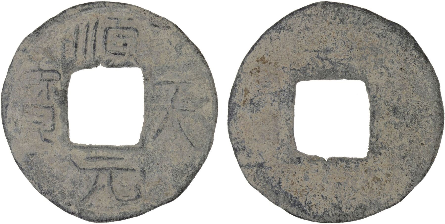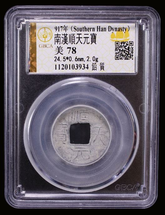 SOUTHERN HAN: Anonymous, 900-971, lead cash (2g), shun tian yuan bao, graded 78 by GBCA Grading Company, F-VF, ex Dr. Dirk Löer Collection. These were part of a series of crude lead cash coins attributed to the Southern Han / Chu area cast circa 900-971 based on Tang Dynasty inscriptions. There is a very great variety of such coins; some have crescents on the reverse, others a variety of characters. The 'kai' character sometimes looks like the character 'yong.' The characters and legends often are reversed because the incompetent workmen had not mastered the art of engraving in negative to make the molds. Some specimens have meaningless characters.