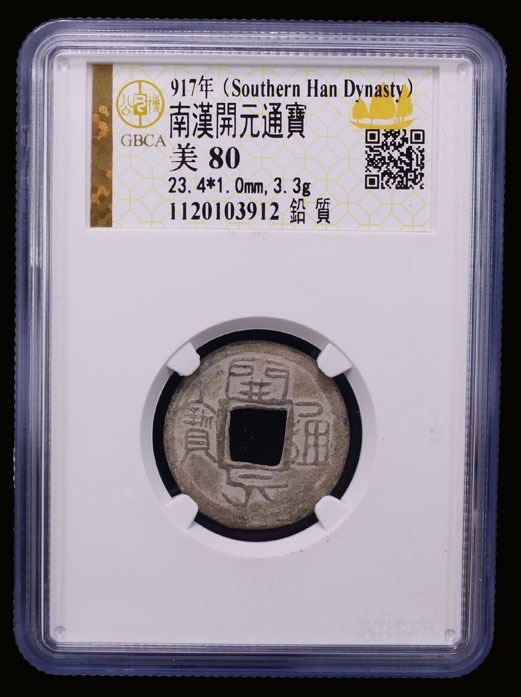 SOUTHERN HAN: Anonymous, 900-971, lead cash (3.3g), H-15.116, kai yuan tong bao, graded 80 by GBCA Grading Company, VF-XF, ex Dr. Dirk Löer Collection. These were part of a series of crude lead cash coins attributed to the Southern Han / Chu area cast circa 900-971 based on Tang Dynasty inscriptions. There is a very great variety of such coins; some have crescents on the reverse, others a variety of characters. The 'kai' character sometimes looks like the character 'yong.' The characters and legends are often reversed because the incompetent workmen had not mastered the art of engraving in negative to make the molds. Some specimens have meaningless characters.