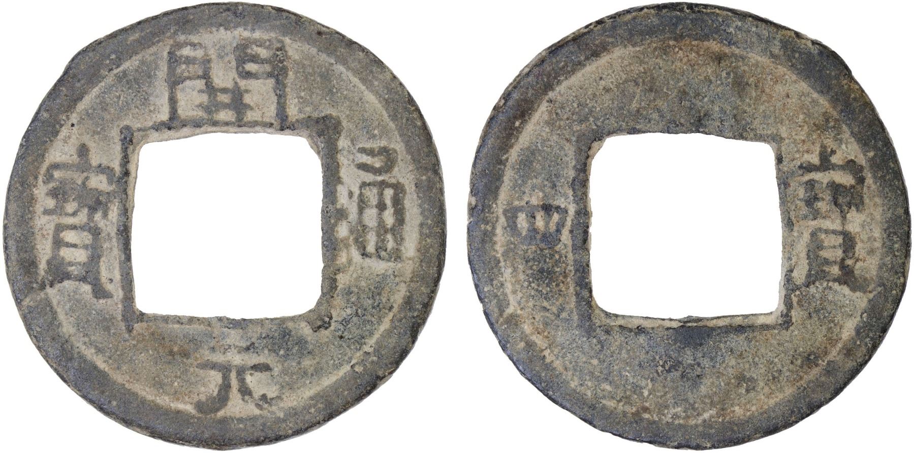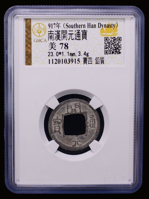 SOUTHERN HAN: Anonymous, 900-971, lead cash (3.4g), H-15.120, kai yuan tong bao // bao si, graded 78 by GBCA Grading Company, VF, ex Dr. Dirk Löer Collection. These were part of a series of crude lead cash coins attributed to the Southern Han / Chu area cast circa 900-971 based on Tang Dynasty inscriptions. There is a very great variety of such coins; some have crescents on the reverse, others a variety of characters. The 'kai' character sometimes looks like the character 'yong.' The characters and legends often are reversed because the incompetent workmen had not mastered the art of engraving in negative to make the molds. Some specimens have meaningless characters.