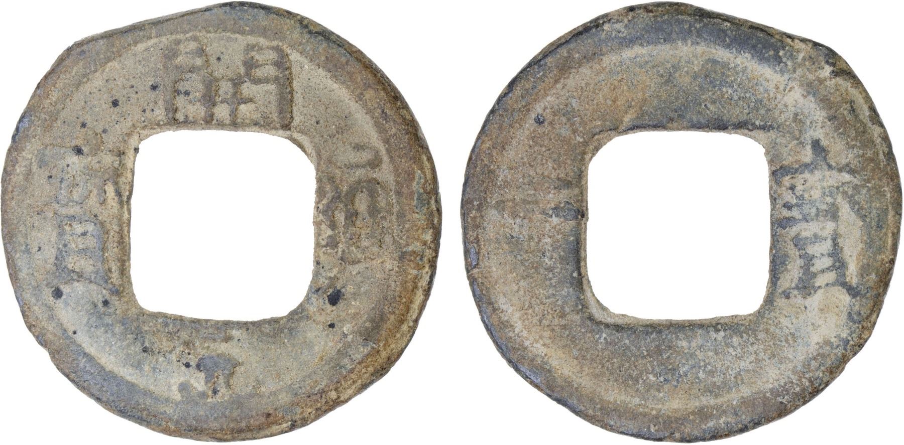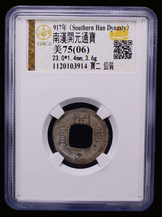 SOUTHERN HAN: Anonymous, 900-971, lead cash (3.6g), H-15.119, kai yuan tong bao // bao er, graded 75(06) by GBCA Grading Company, artificial defect, VF, ex Dr. Dirk Löer Collection. These were part of a series of crude lead cash coins attributed to the Southern Han / Chu area cast circa 900-971 based on Tang Dynasty inscriptions. There is a very great variety of such coins; some have crescents on the reverse, others a variety of characters. The 'kai' character sometimes looks like the character 'yong.' The characters and legends often are reversed because the incompetent workmen had not mastered the art of engraving in negative to make the molds. Some specimens have meaningless characters.