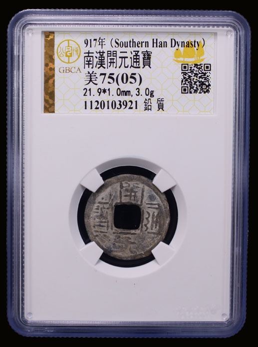 SOUTHERN HAN: Anonymous, 900-971, lead cash (3g), H-15.140, kai yuan tong bao, crescent above on reverse, graded 75(05) by GBCA Grading Company, natural flan crack, F-VF, ex Dr. Dirk Löer Collection. These were part of a series of crude lead cash coins attributed to the Southern Han / Chu area cast circa 900-971 based on Tang Dynasty inscriptions. There is a very great variety of such coins; some have crescents on the reverse, others a variety of characters. The 'kai' character sometimes looks like the character 'yong.' The characters and legends often are reversed because the incompetent workmen had not mastered the art of engraving in negative to make the molds. Some specimens have meaningless characters.