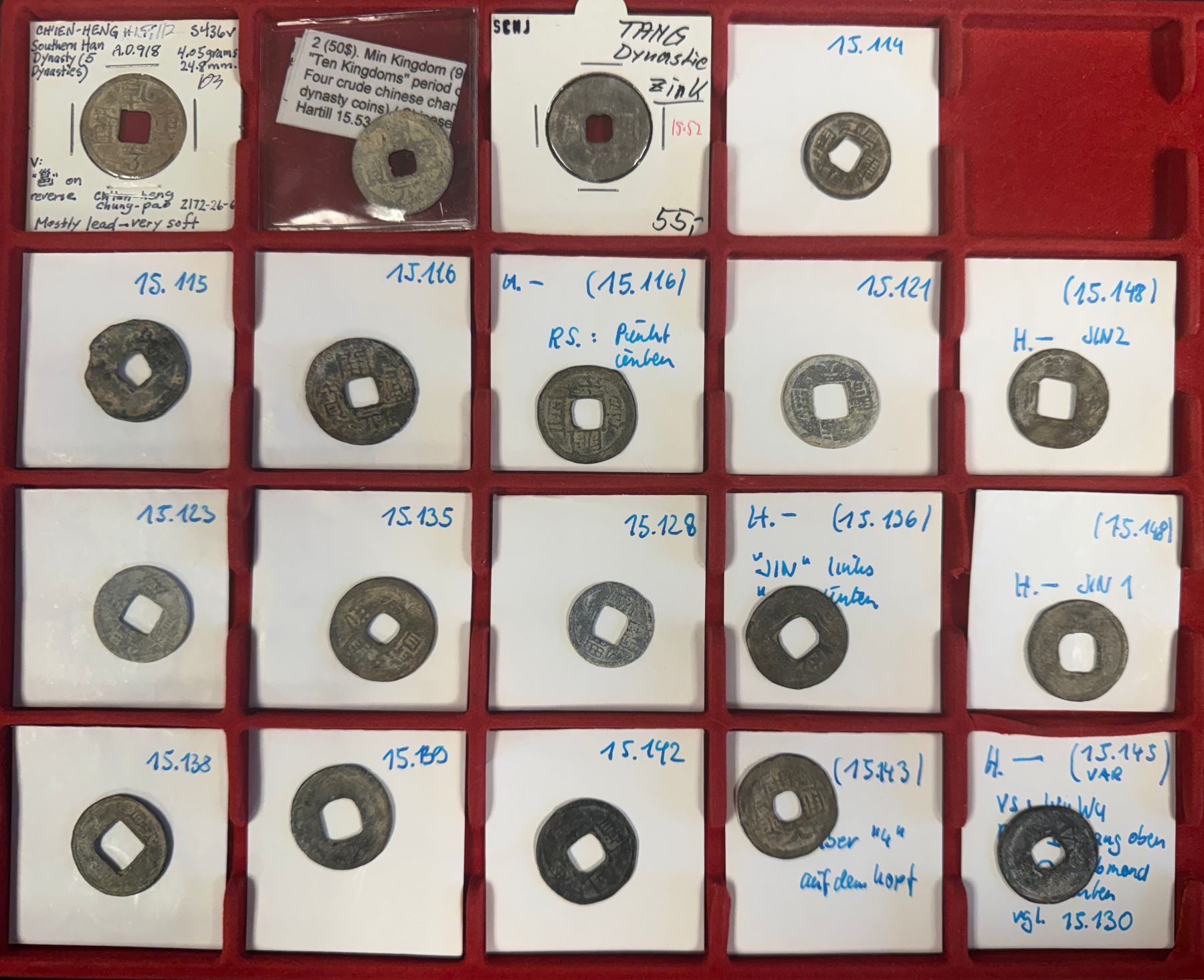 SOUTHERN HAN: LOT of 19 lead coins, most with Kai Yuan obverse, a few with other reign titles or with wu wu, various reverse characters and issue numbers, all attributed, including Hartill-15.112, 114, 115, 116, 116var (reverse dot below), 121, 123, 128, 135, 136var (different arrangement), 138, 139, 142, 143var (reverse 4 below), 145var (reverse of 130), 148var (reverse of 136), 148var (reverse of 137), plus two of Min (15.52); most in average conditions, a good study lot from this very interesting series; retail value $750, lot of 19 pieces, ex Dr. Dirk Löer Collection.