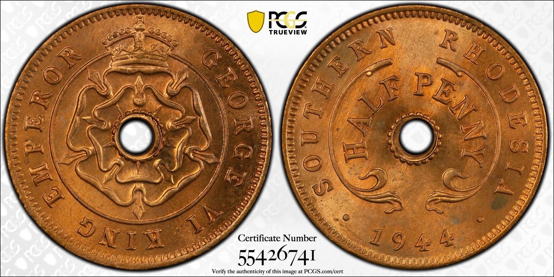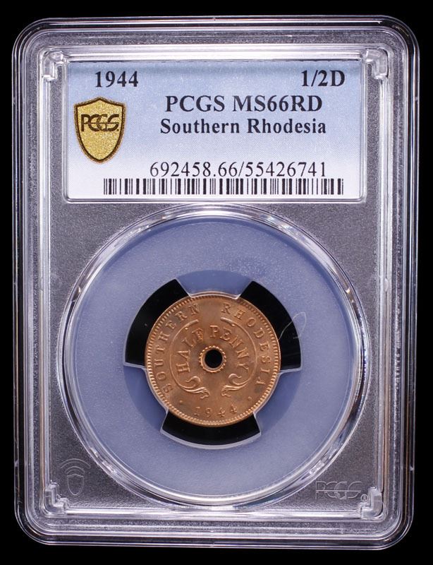 SOUTHERN RHODESIA: George VI, 1936-1952, AE 1/2 penny, 1944, PCGS MS66 RD
