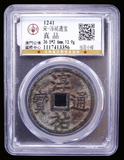SOUTHERN SONG: Chun You, 1241-1252, AE 100 cash (13.9g), H-17.809, type with small flan size and small characters, denomination dang bai on reverse, some discoloration, smoothing scratches, graded Genuine by GBCA Grading Company, Choice VF.
