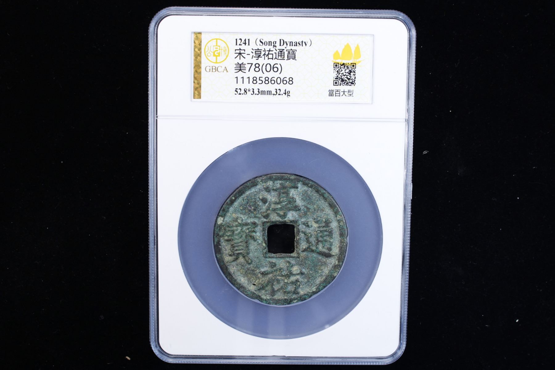 SOUTHERN SONG: Chun You, 1241-1252, AE 100 cash (32.4g), H-17.806, 53mm, large size flan type, dang bai (value one hundred) on reverse, graded 78(06) by GBCA Grading Company, artificial defect, VF-XF, ex Dr. Dirk Löer Collection. Emperor Lizong of Song was the 14th emperor of the Song dynasty of China and the fifth emperor of the Southern Song dynasty. He reigned from 1224-1264 and under the reign title Chunyou from 1241-1252. He ruled under a total of eight different reign titles while emperor. In his forty year reign, he did little to nothing to improve the Dynasty and instead sought pleasure even as the Mongols were terrorizing the borders.