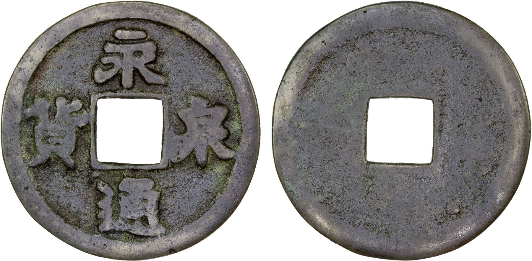 SOUTHERN TANG: Yong Tong, 943-961, AE 10 cash (13.9g), H-15.78, yong tong quán huò ("the Eternal circulation coin"), cast after the year 959, graded 80 by GBCA Grading Company, Fine, ex Dr. Dirk Löer Collection, ex Champion Hong Kong Lot 307. Li Jing was short of funds for his army at that time. His minister Zhong Mo obtained permission to cast large coins, one equal to ten small coins, with this inscription. In 964, the coin was withdrawn when Zhong Mo incurred the displeasure of the Emperor.