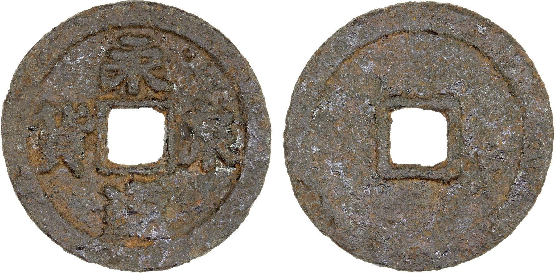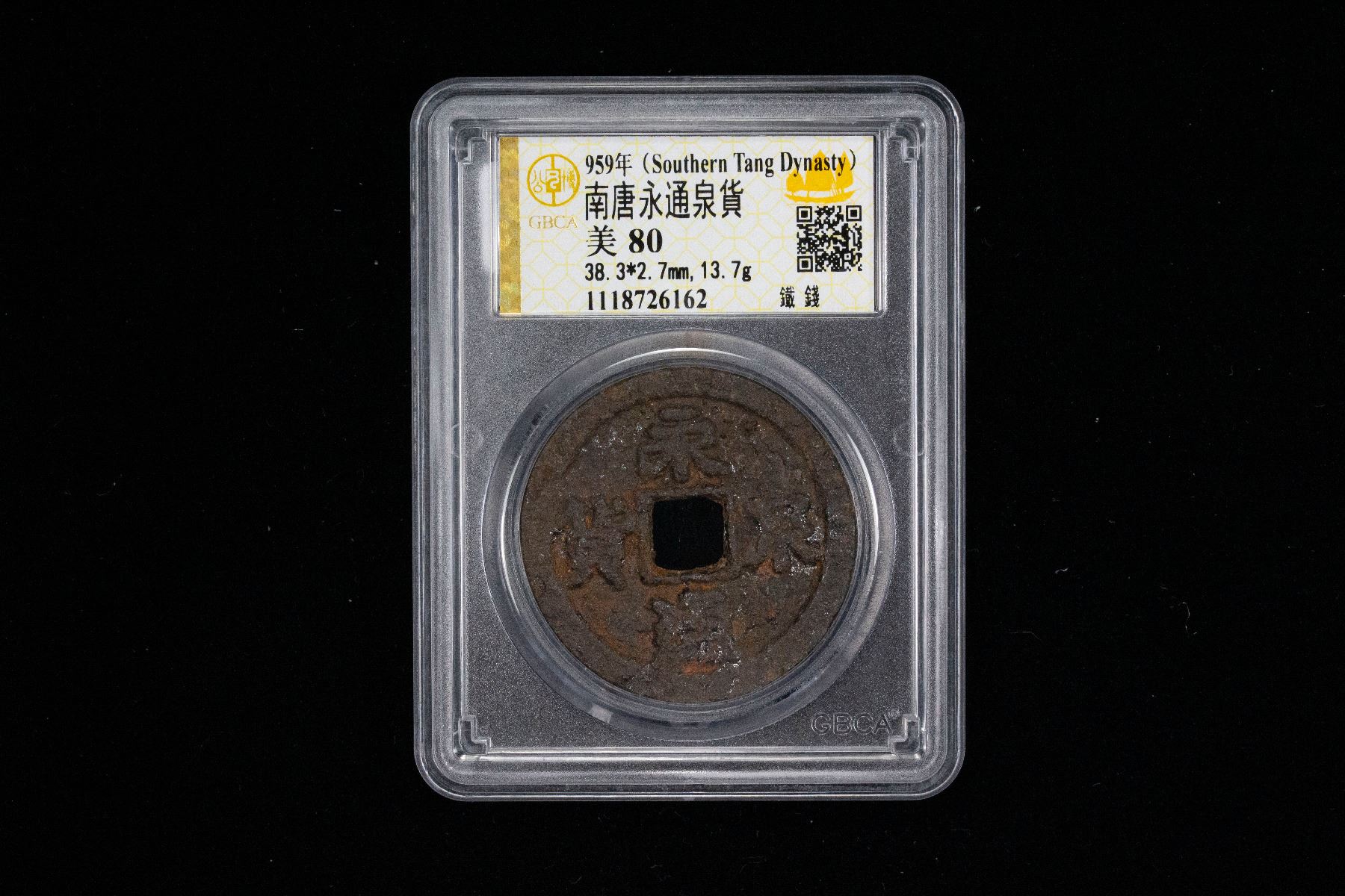 SOUTHERN TANG: Yong Tong, 943-961, iron 10 cash (13.78g), H-15.78A, yong tong quán huò ("the Eternal circulation coin"), graded 78 by GBCA Grading Company, VF, ex Dr. Dirk Löer Collection, ex Stephen Album Rare Coins Auction 40, Lot 1027. Li Jing was short of funds for his army at that time. His minister Zhong Mo obtained permission to cast large coins, one equal to ten small coins, with this inscription. In 964, the coin was withdrawn when Zhong Mo incurred the displeasure of the emperor.