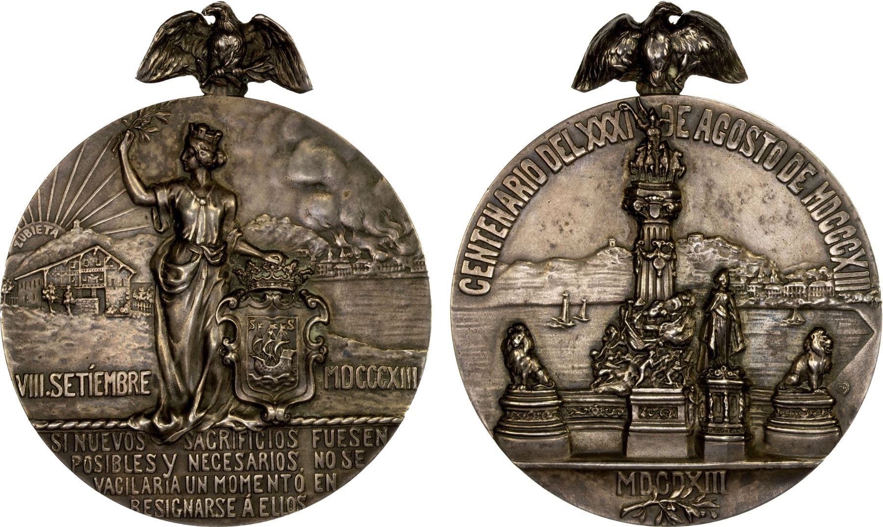 SPAIN: AR medal, 1913, PG-797, 40mm silver medal with eagle above by Zubieta for the Centennial of the Siege of San Sebastián; VIII SETIEMBRE / MDCCCXIII either side of a crowned female figure raising a laurel branch with her right hand and resting her left hand on the crowned shield of San Sebastián, burning city in background, SI NUEVOS SACRIFICIOS FUESEN / POSIBLES Y NECESARIOS NO SE / VACILARIA UN MOMENTO EN / RESIGNARSE A ELLOS in exergue // CENTENARIO DEL XXXI DE AGOSTO DE MDCCCXIII above Monument with a maritime landscape in the background, XF. In the Siege of San Sebastián (July 7 – September 8, 1813), part of the Peninsular War, Allied forces were under the command of Arthur Wellesley, Marquess of Wellington failed to capture the city in a siege.