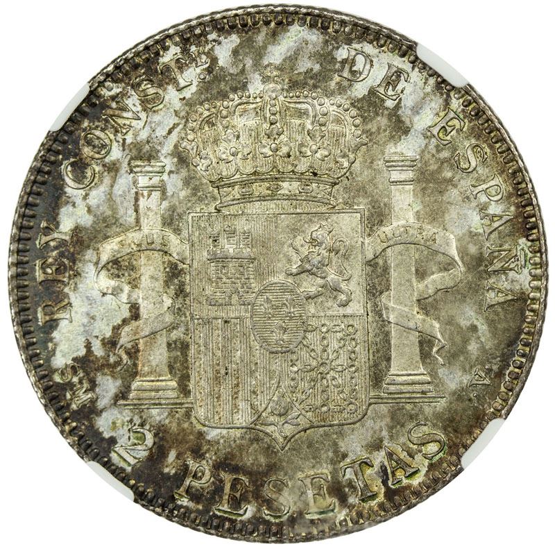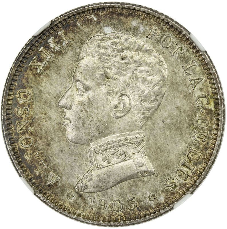 SPAIN: Alfonso XIII, 1886-1931, AR 2 pesetas, 1905(05), KM-725, initials SM-V, lovely iridescent toning, NGC graded MS65.