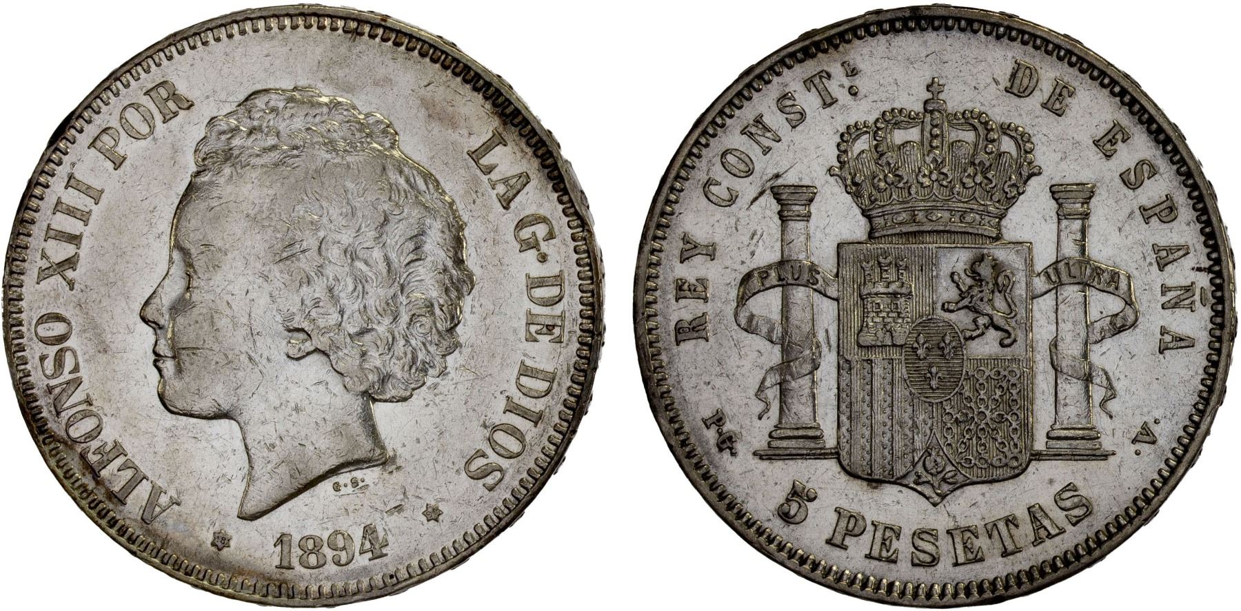 SPAIN: Alfonso XIII, 1886-1931, AR 5 pesetas, 1894 (94), XF
