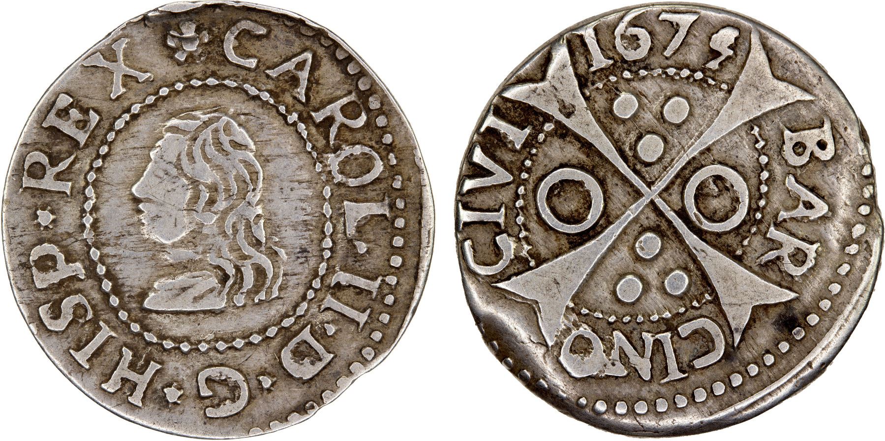 SPAIN: Carlos II, 1661-1700, AR croat (2.60g), Barcelona, 1675, KM-40, Cal-205, slight bend near edge, Choice VF.