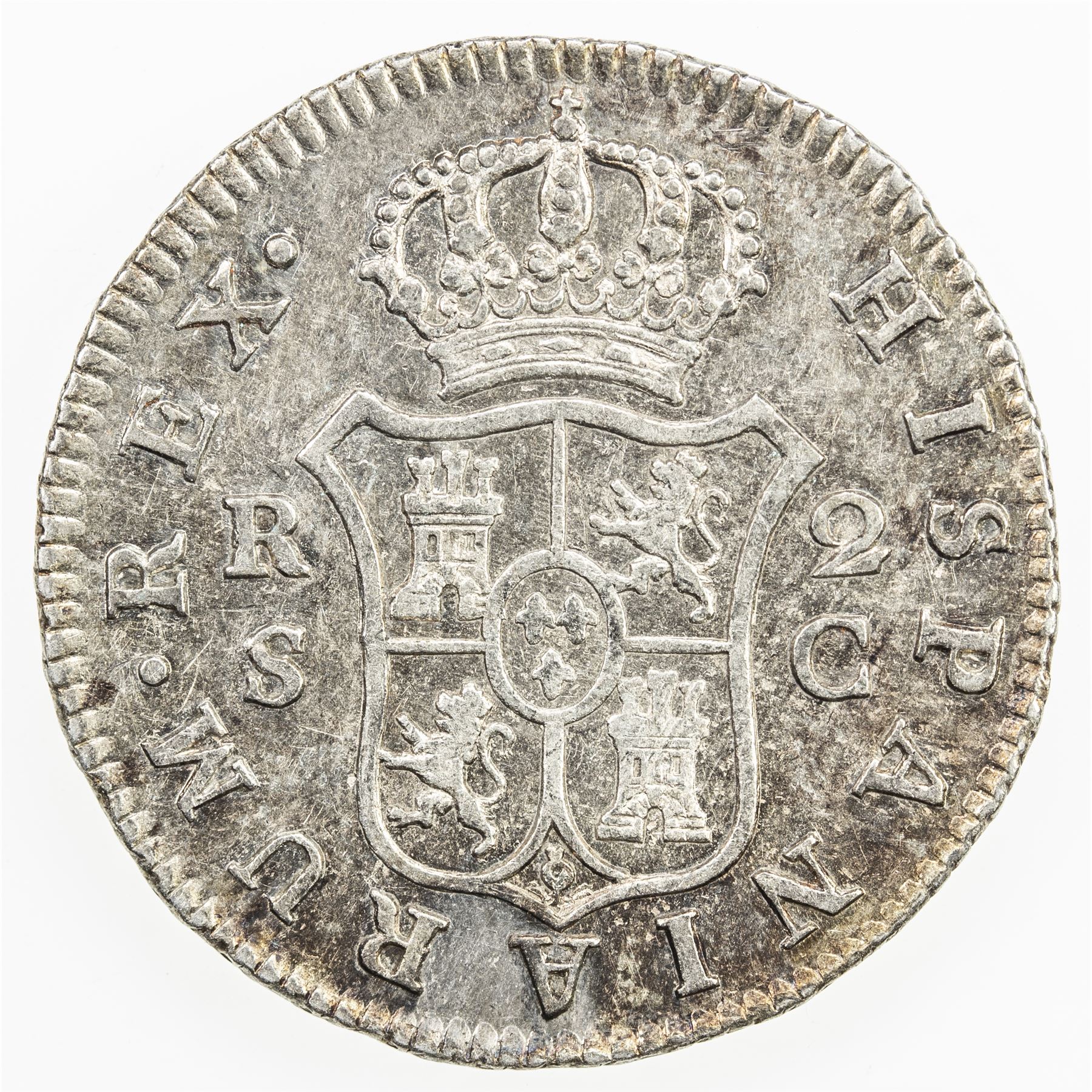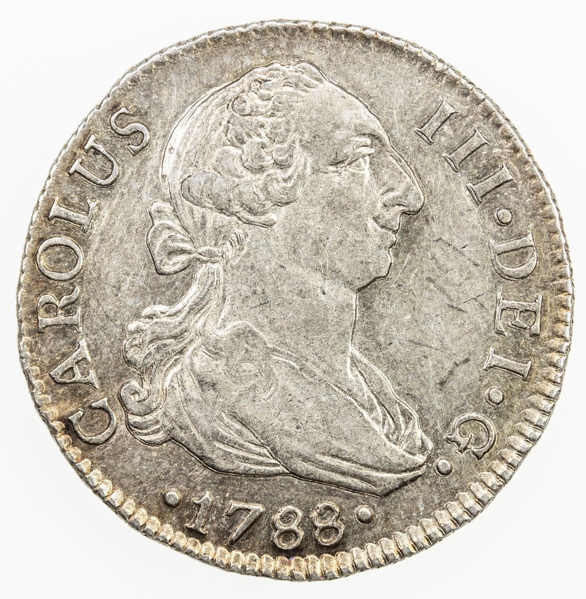 SPAIN: Carlos III, 1759-1788, AR 2 reales, 1788-S, KM-412.2, AC-790, initial C, only year for this assayer, light toning, EF to AU