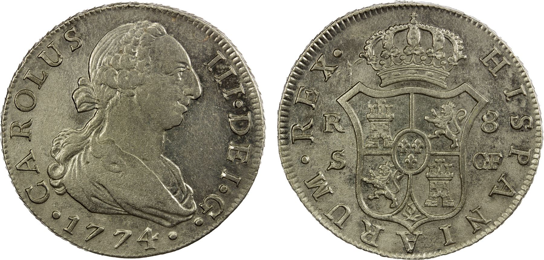SPAIN: Carlos III, 1759-1788, AR 8 reales, 1774-S, KM-414.2, assayer CF, cleaned, XF-AU, ex SARC Auction 49, Lot 3153.