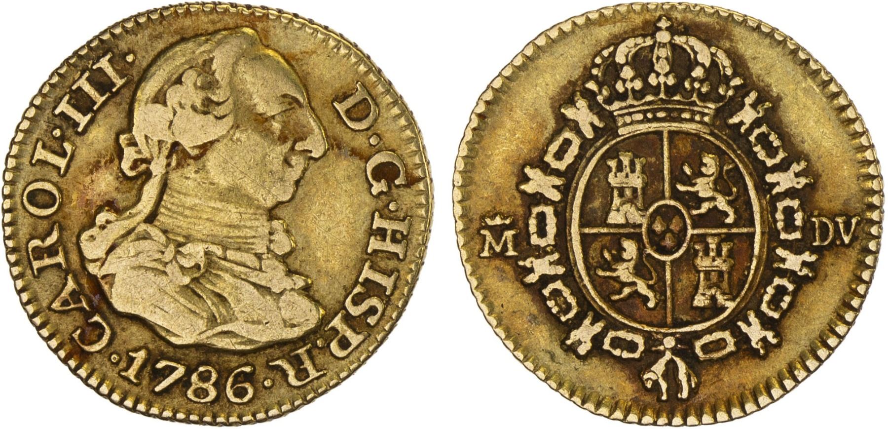 SPAIN: Carlos III, 1759-1788, AV 1/2 escudo, Madrid, 1786-M, KM-425.1, Fr-290, assayer DV, Fine.