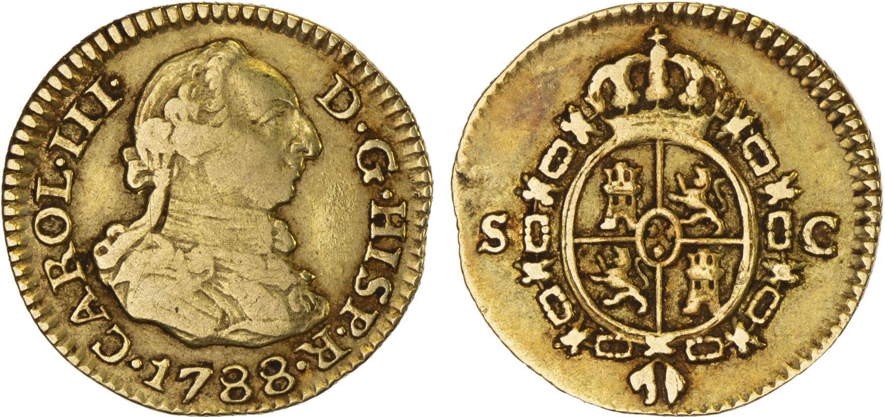 SPAIN: Carlos III, 1759-1788, AV 1/2 escudo, Seville, 1788-S, KM-425.2, Fr-291, assayer C, Fine.