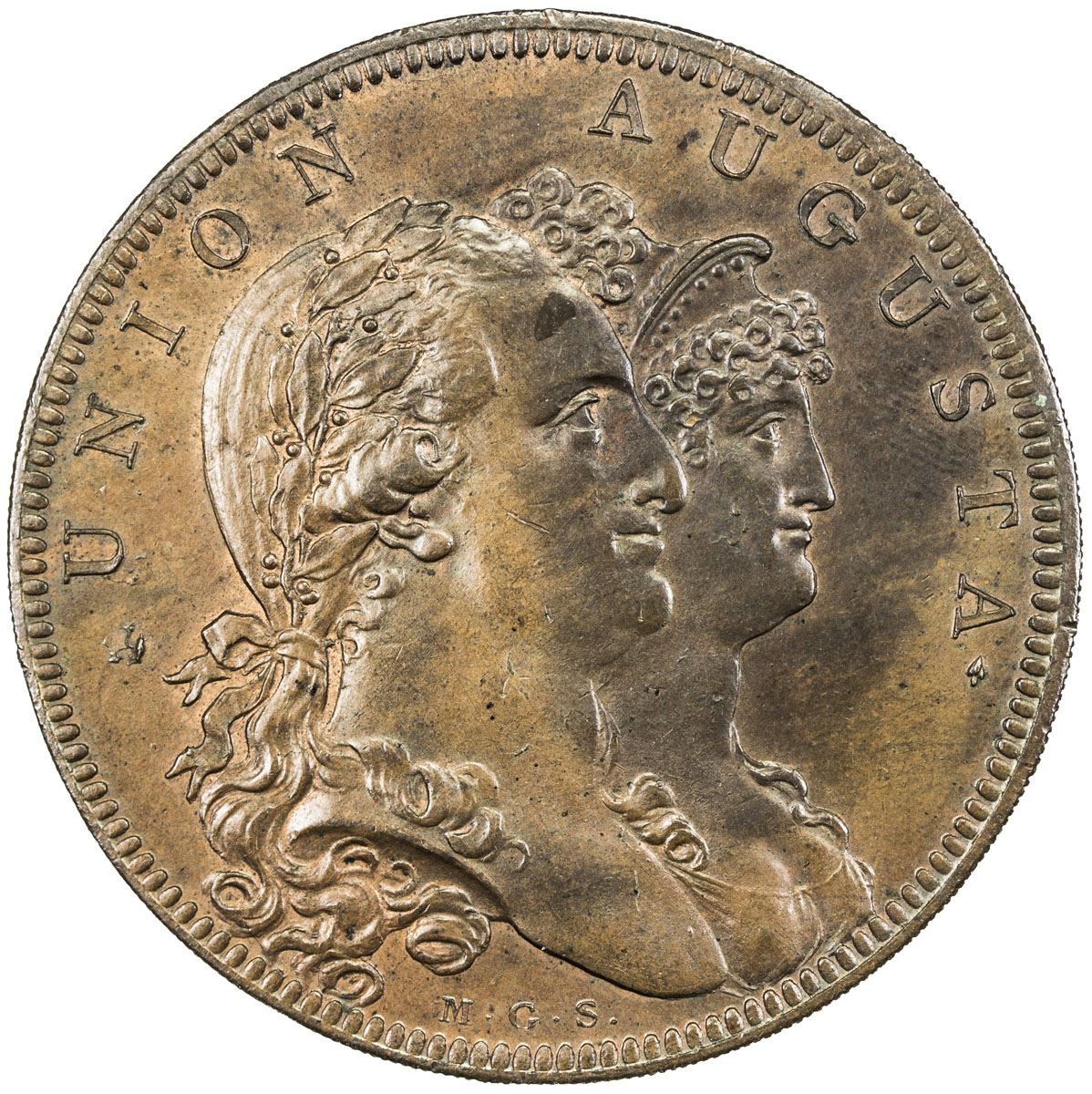 SPAIN: Carlos IV, 1788-1808, AE medal (28.37g), 1801, Bramsen-187, Julius-1035, 40mm bronze medal for the Union Augusta by J. P. Droz, conjoined heads right of Carlos and Maria Luisa with UNION AUGUSTA above // EVITANDO / EL FRAUDE / DILACION Y GASTOS / IDENTIFICA / LOS SIGNOS. in center with * J.P. DROZ INVENTOR DEL METODO DE MULTIPLICAR LOS TROQUELES * 1801 around, some red, lettered edge, AU.