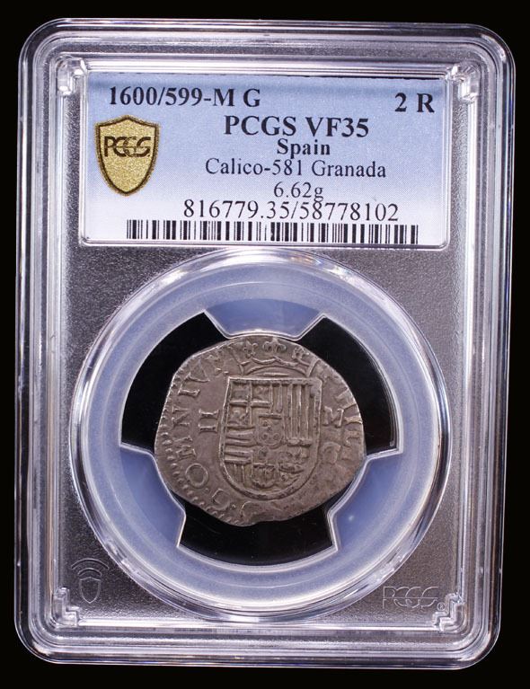 SPAIN: Felipe III, 1598-1621, AR 2 reales (6.62g), Granada, 1600/599-M, KM-26.3, Aureo & Calicó-581, Xavier Calicó-318, cob issue, a pleasing wholesome example, PCGS graded VF35.