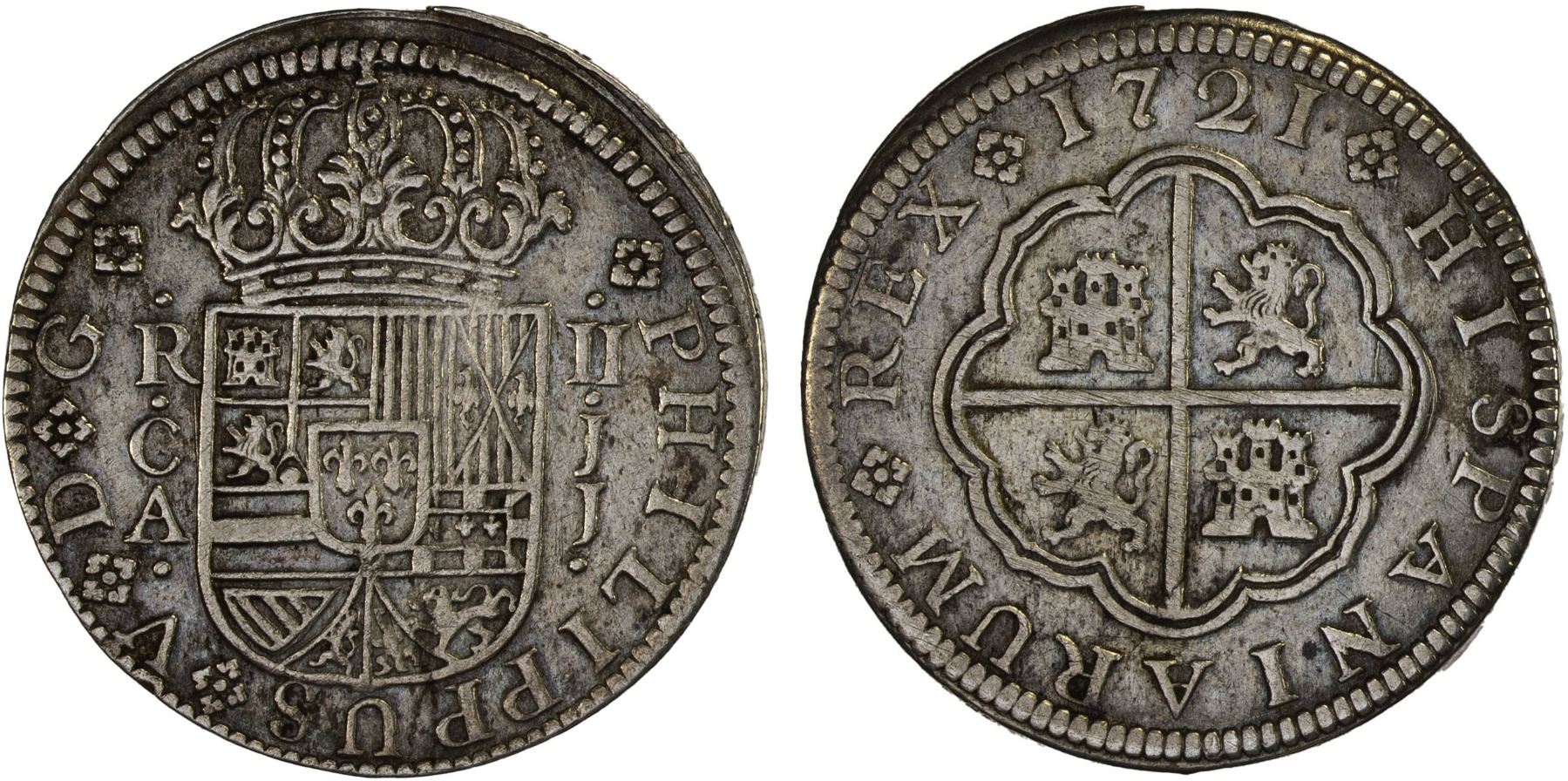 SPAIN: Felipe V, 1700-1746, AR 2 reales, Cuenca, 1721-CA, KM-308, assayer JJ, F-VF.