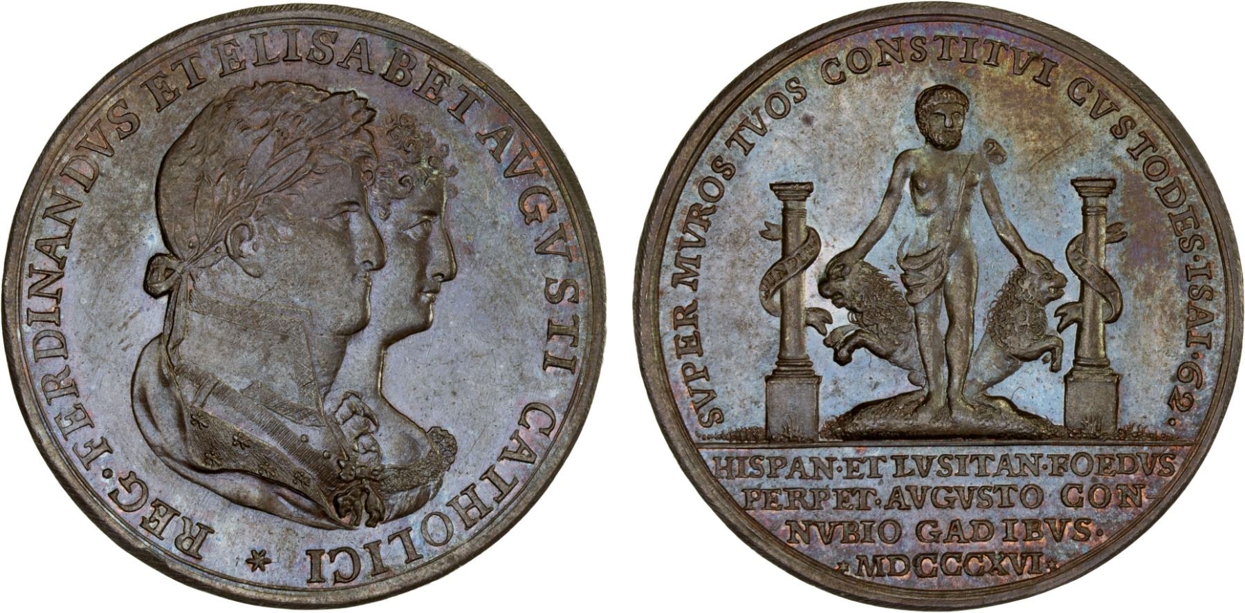 SPAIN: Fernando VII, 1808-1833, AE medal (19.46g), 1816, Vives-323, 35mm, royal wedding of Ferdinand VII and Elizabeth (Isabel de Braganza), some light hairlines, fabulous surfaces, Unc.