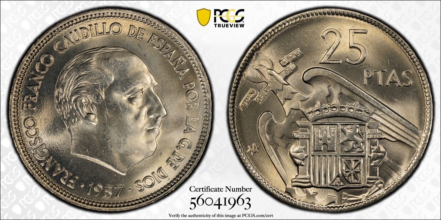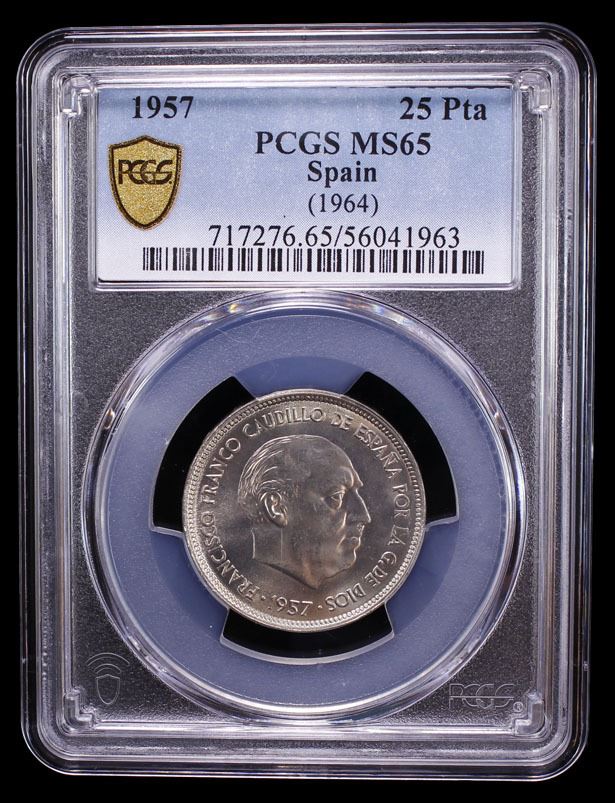 SPAIN: Francisco Franco, Caudillo, 1947-1975, 25 pesetas, 1957 (64), PCGS MS65