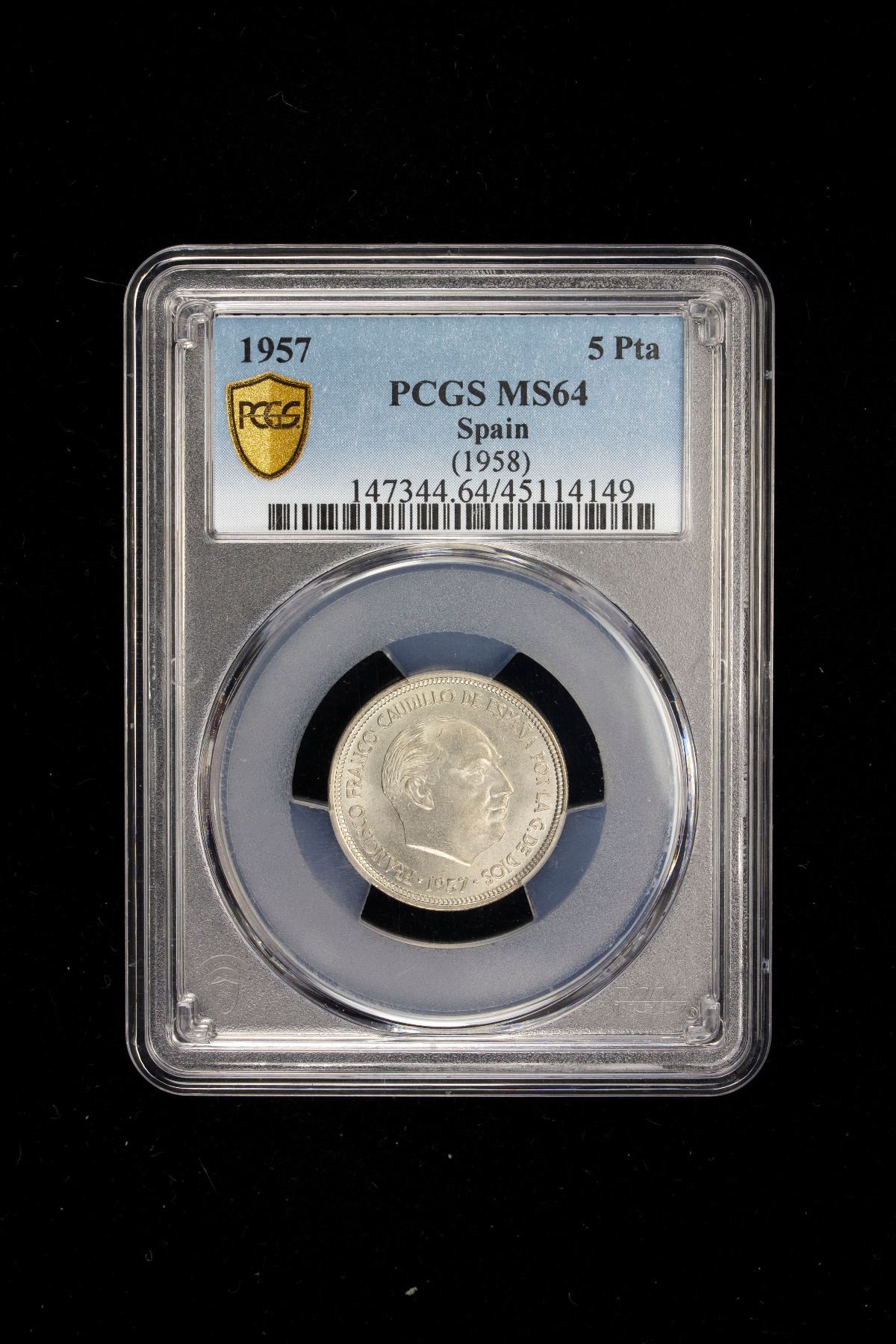 SPAIN: Francisco Franco, caudillo, 1947-1975, 5 pesetas, 1957(58), PCGS MS64