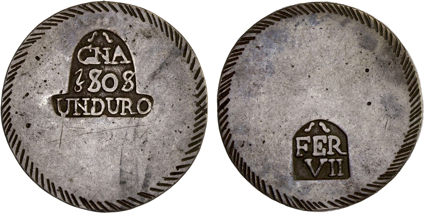SPAIN: Gerona: Fernando VII, 1808-1833, AR duro (5 pesetas), 1808, KM-10, Cr-L41, a few light reverse scratches, one-year type, F-VF.