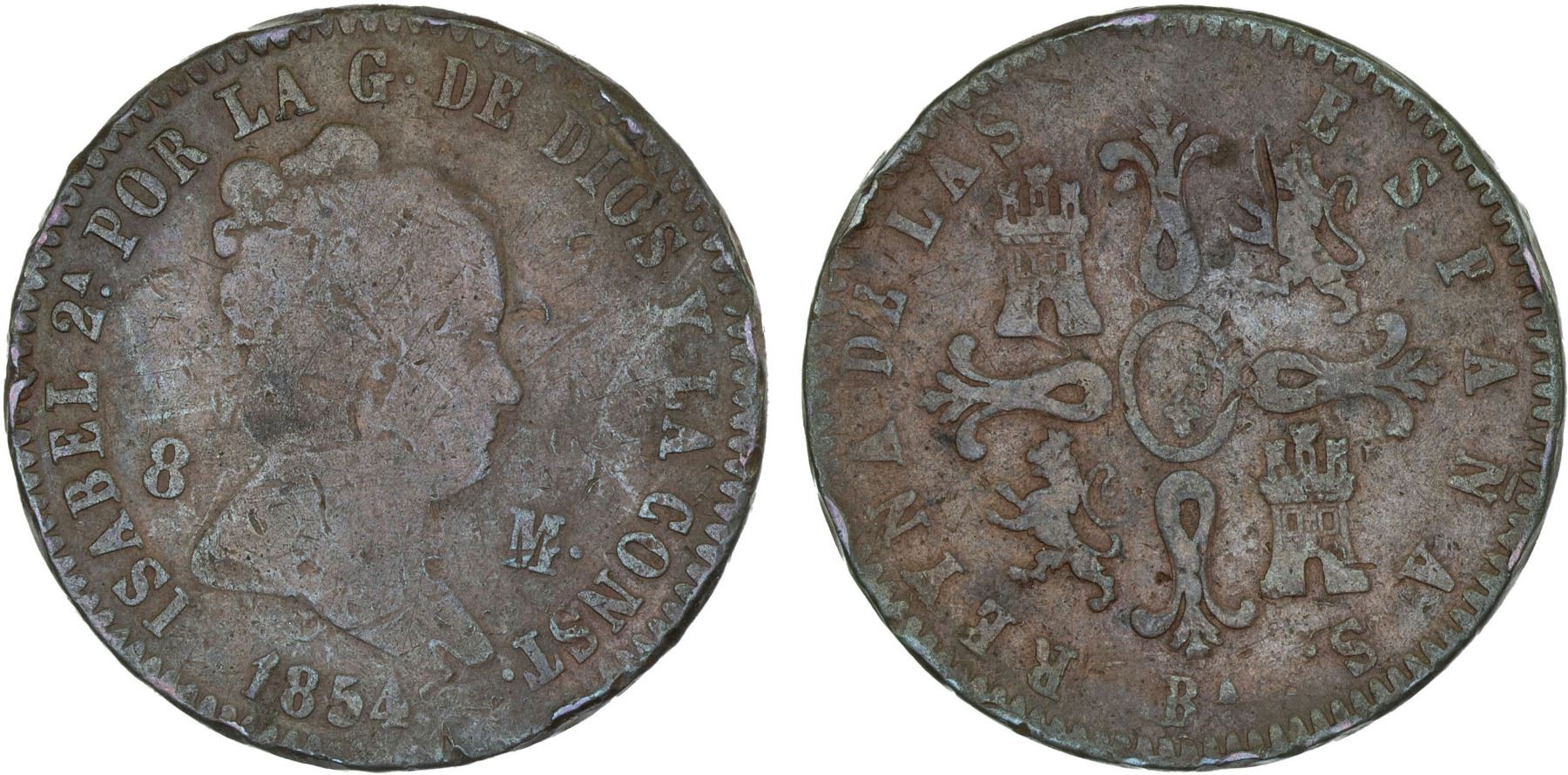 SPAIN: Isabel II, 1833-1868, AE 8 maravedis, 1854-Ba, VG to Fine