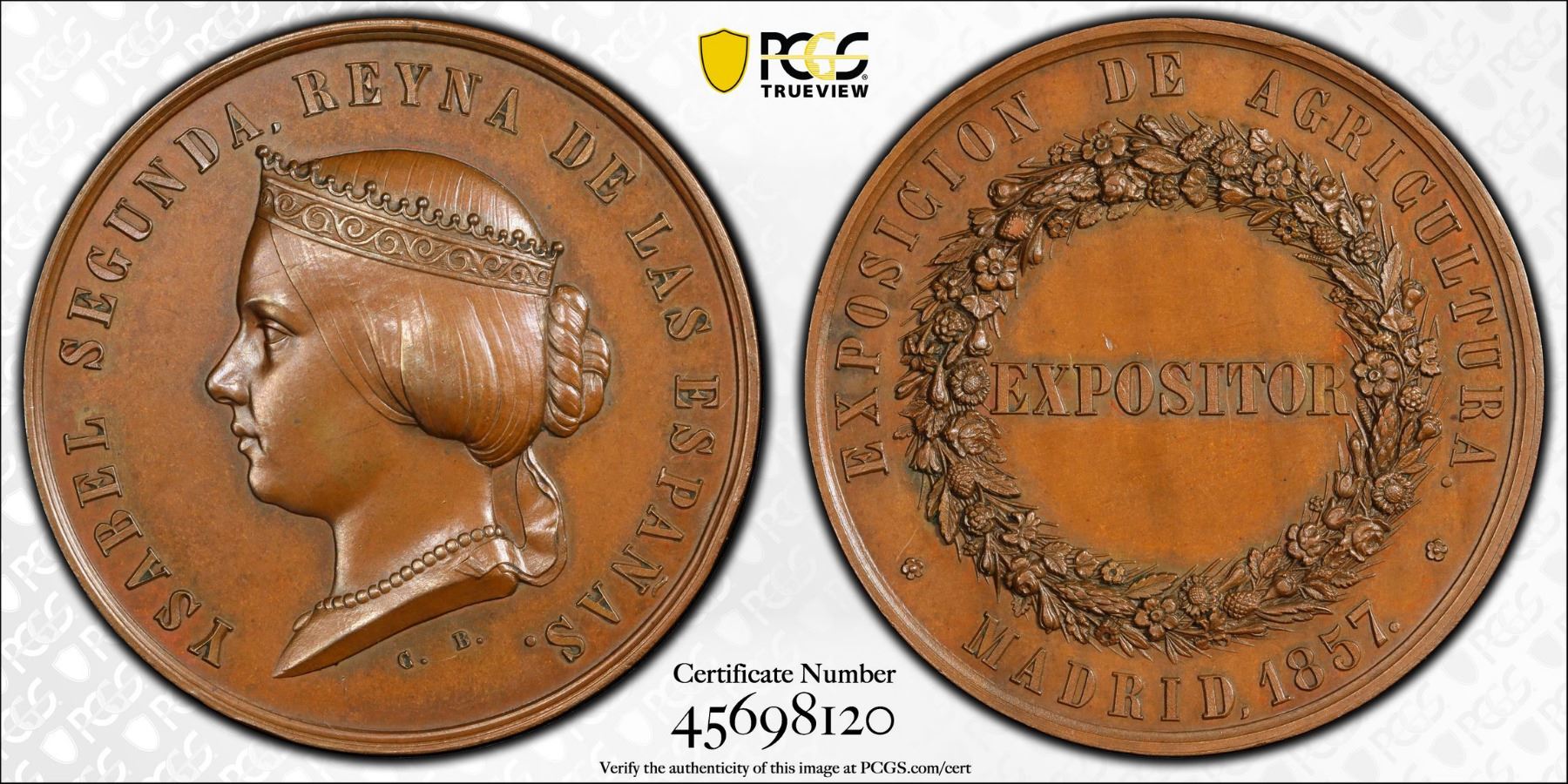 SPAIN: Isabel II, 1833-1868, AE medal, 1857, Patr-684, 43mm bronze medal for the Madrid Agriculture Exhibition; YSABEL SEGUNDA REYNA DE LAS ESPAÑAS around bust of Queen left // EXPOSICIÓN DE AGRICULTURA / MADRID within wreath, EXPOSITOR within, a lovely lustrous chocolate brown specimen! PCGS graded Specimen 63.
