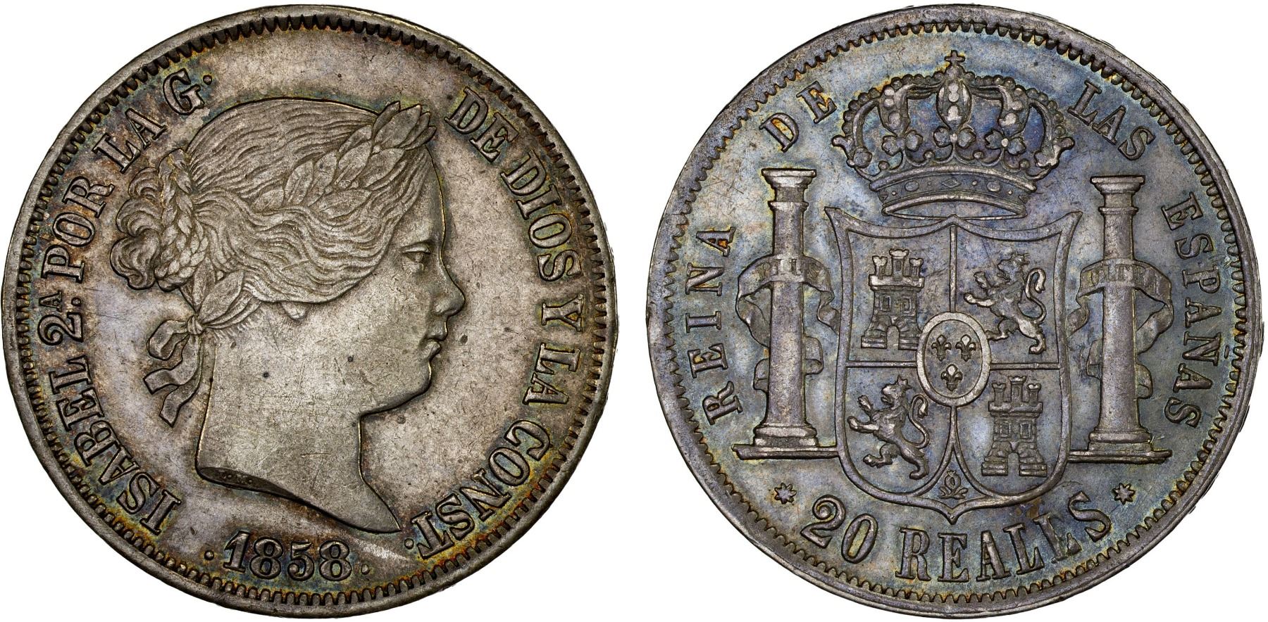SPAIN: Isabel II, 1833-1868, AR 20 pesetas, Sevilla, 1858, Choice XF