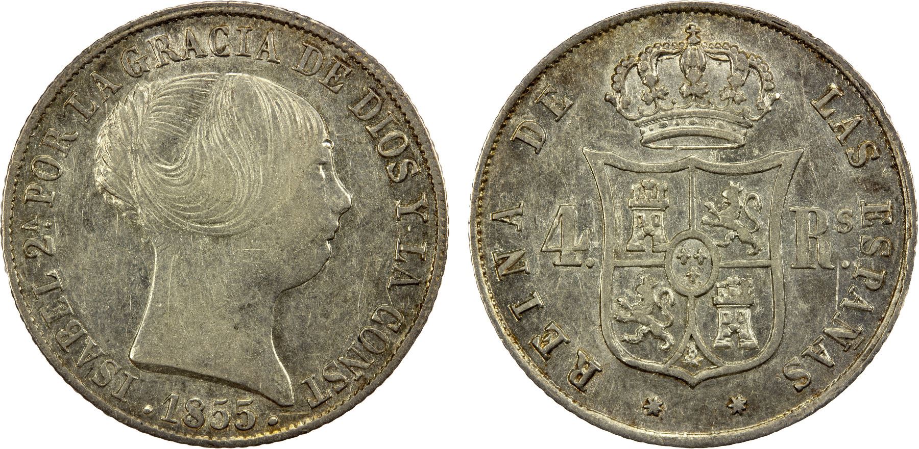 SPAIN: Isabel II, 1833-1868, AR 4 reales, Seville, 1855, KM-600.3, AC-489, key date, XF, ex Joe Sedillot Collection.