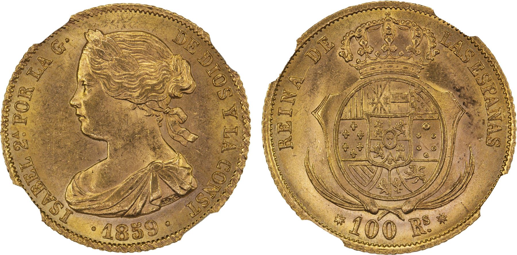 SPAIN: Isabel II, 1833-1868, AV 100 reales, Barcelona, 1859, NGC MS64