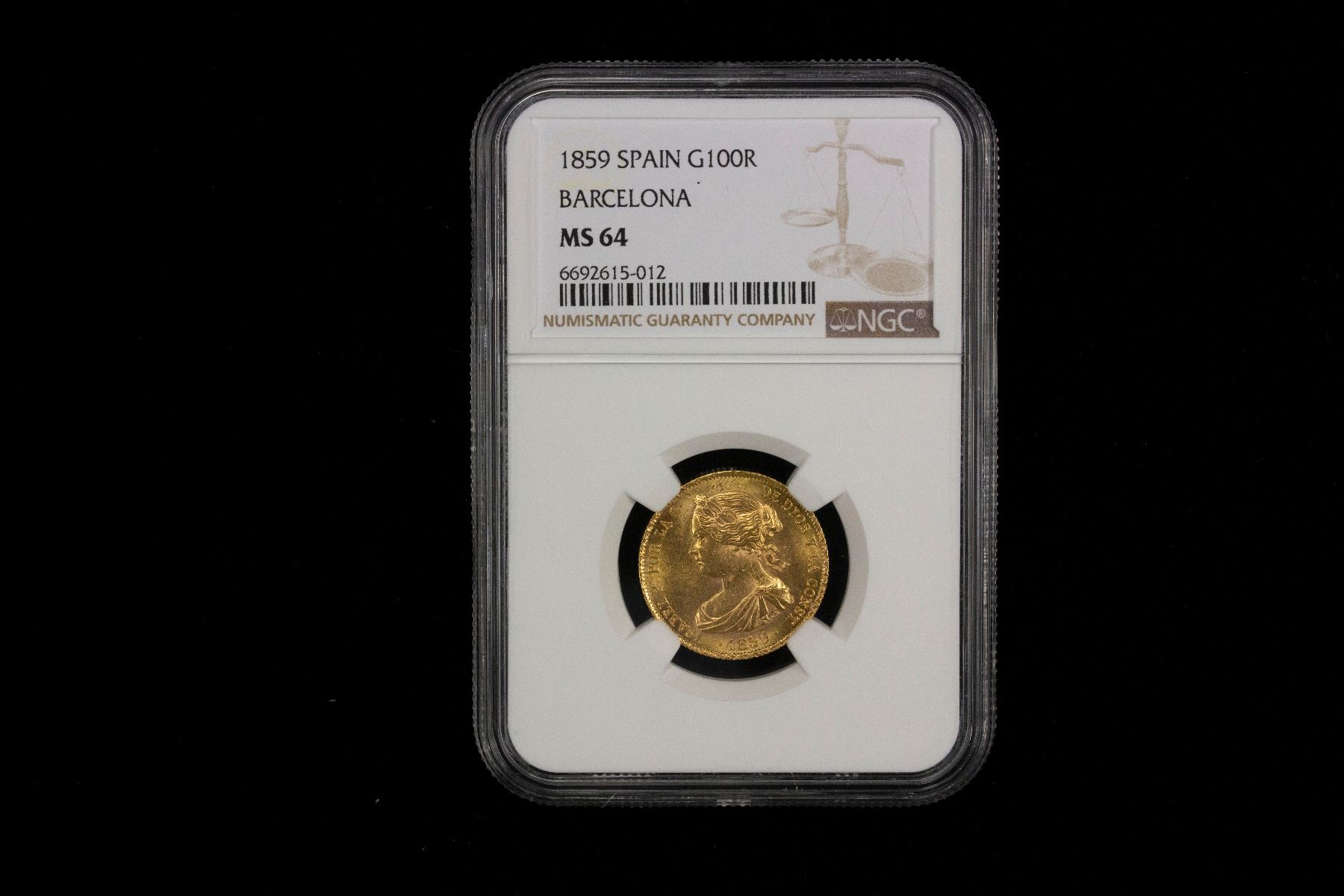 SPAIN: Isabel II, 1833-1868, AV 100 reales, Barcelona, 1859, KM-605.1, a wonderful lustrous mint state example! NGC graded MS64.