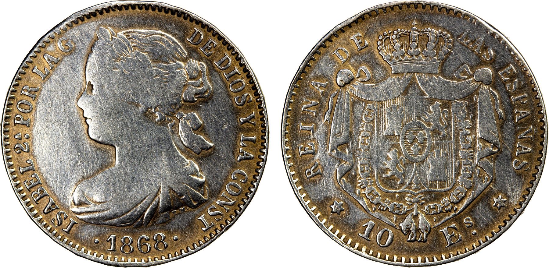 SPAIN: Isabel II, 1833-1868, gilt 10 escudos (8.12g), 1868 (68), as KM-636.1, contemporary imitation, with most of the plating worn off the obverse, cleaned, F-VF. These counterfeits were made from platinum, which was cheap at the time, and gold-plated. It is presumed that the platinum originated in South America and was initially imported into Spain. Circumstantial evidence points to the counterfeiting taking place in Barcelona or the surrounding region.