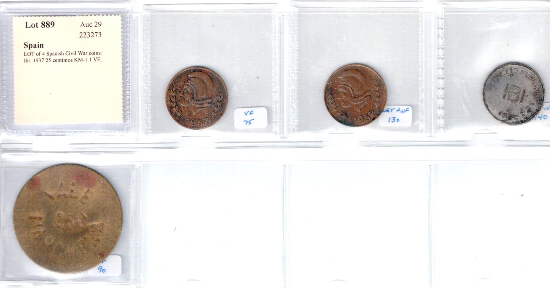 SPAIN:LOT of 4 Spanish Civil War coins: Ibi: 1937 25 centimos KM-1.1 VF, 1937 25 centimos KM-1.2 F-VF, 1937 peseta F-VF; and Marchena: ND (1936) 25 centimos KM-1.1 VF, retail value $525, lot of 4 items.