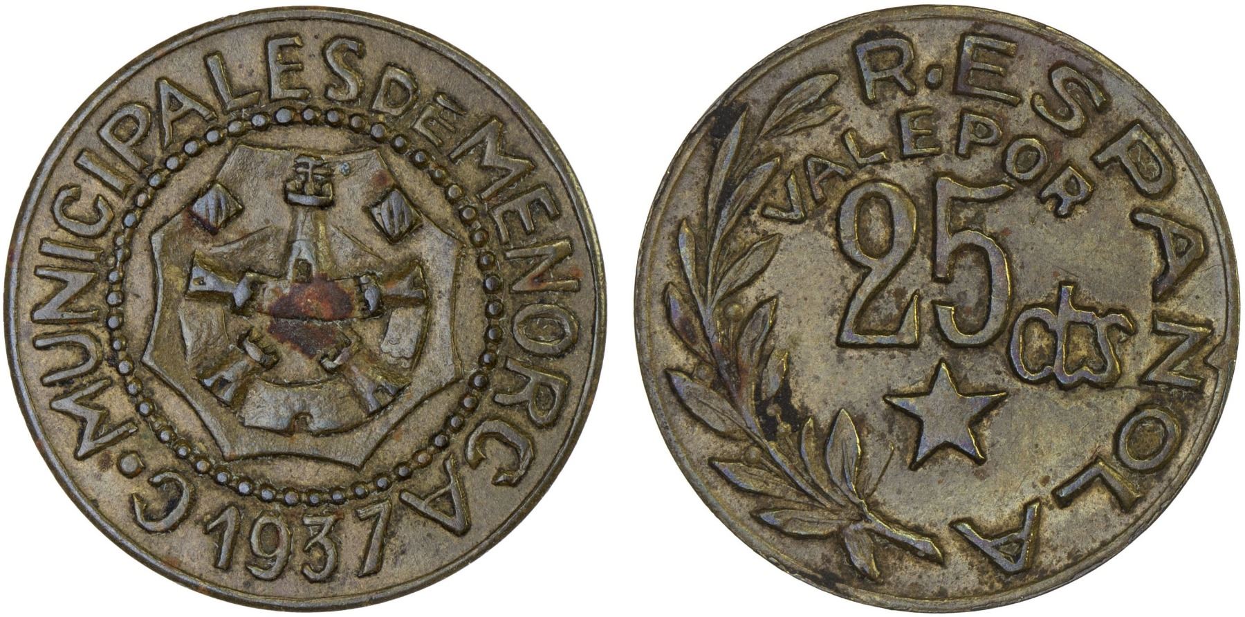 SPAIN: Menorca, Civil War Issue, 25 centimos, 1937, KM-3, obverse spot, VF-XF.