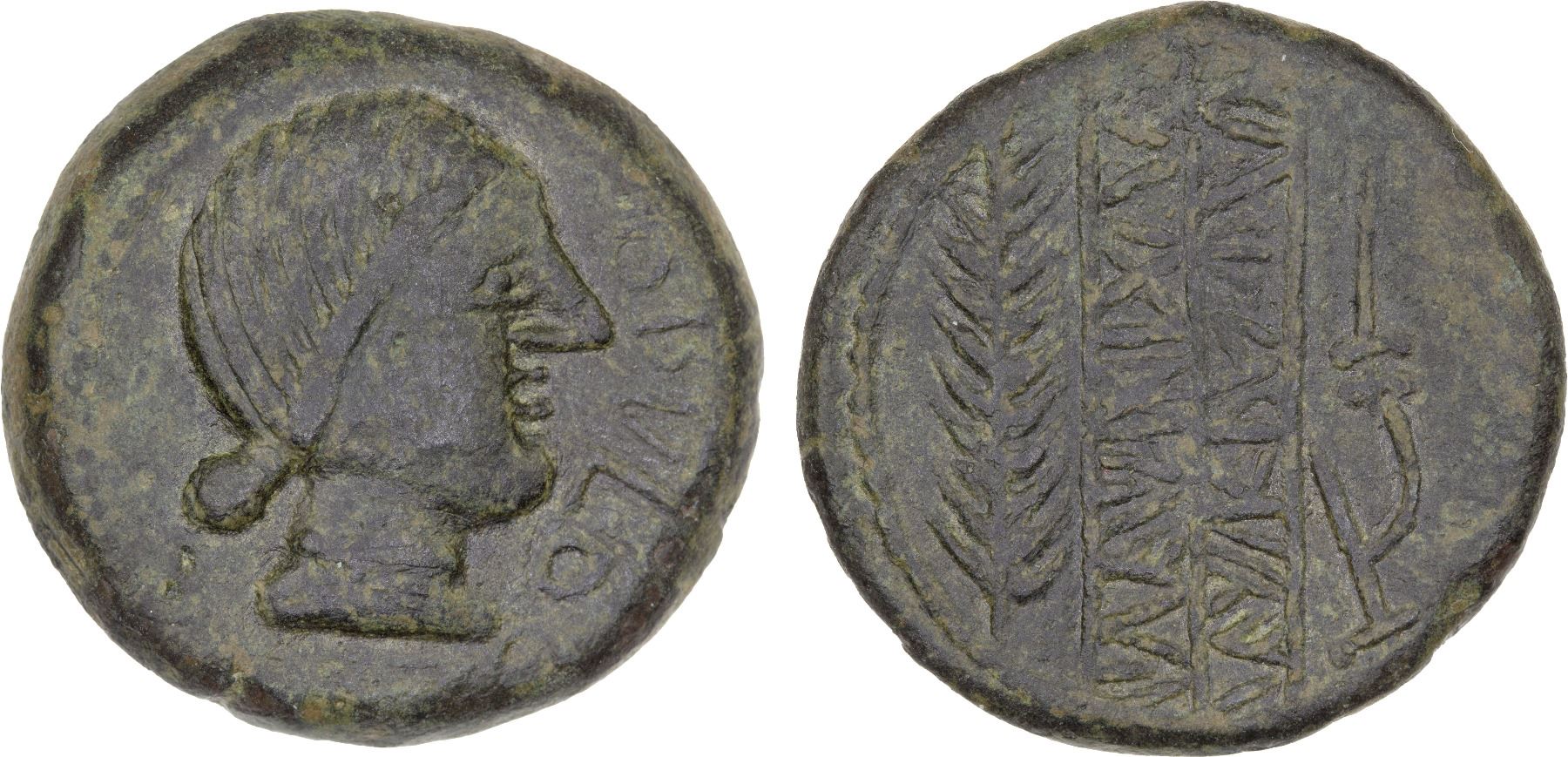 SPAIN: Obulco (Porcuna), AE as (18.93g), ca. 220-20 BC, ACIP-2187, female head right, OBVLCO before // two-line Celtiberian text IltiRatiN / KoLON, plow above, grain ear below, light smoothing, Choice VF.